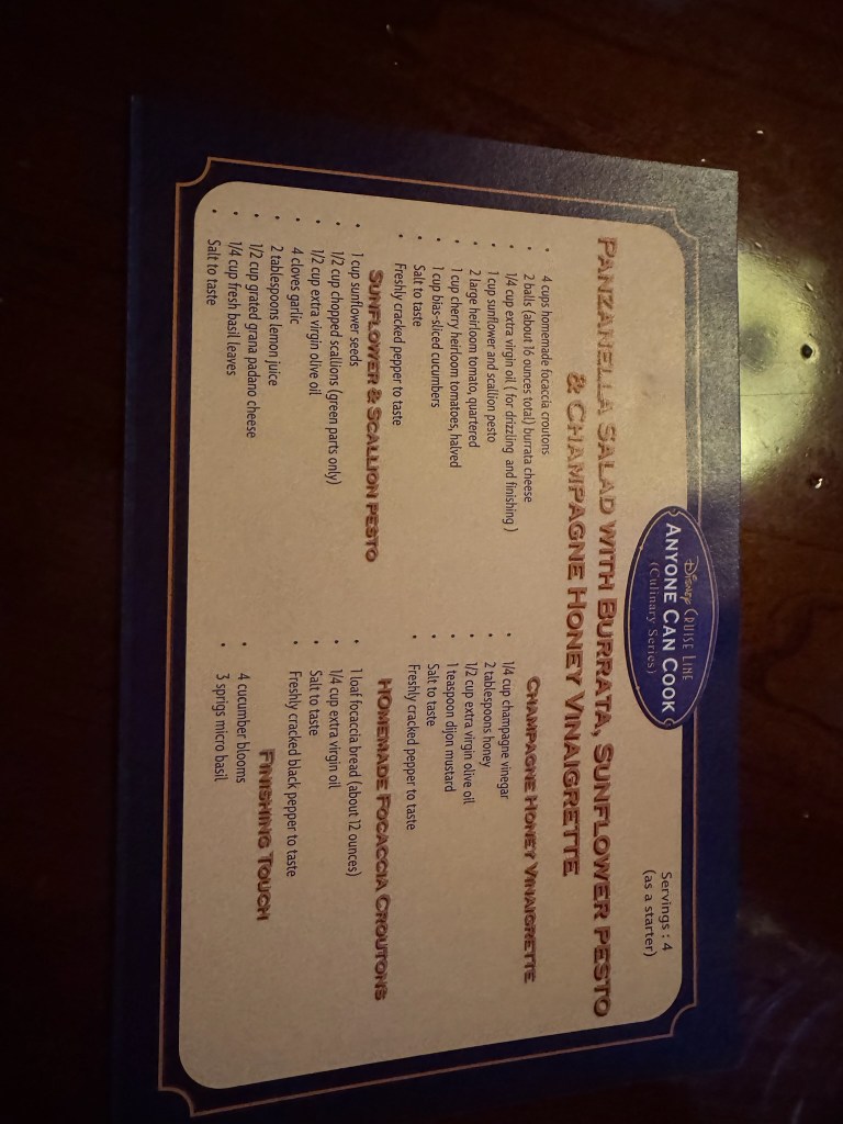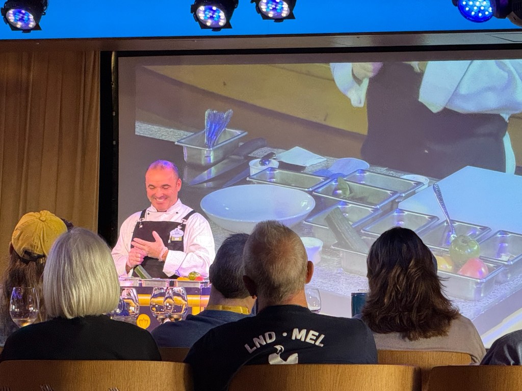 He made a Panzanelle salad while giving tips and tricks for in the kitchen. If your basil is starting to look a little puny, blanch it – it will make it green and pretty and extend the life a day or two. He’s going to be offering several sessions throughout the cruise.