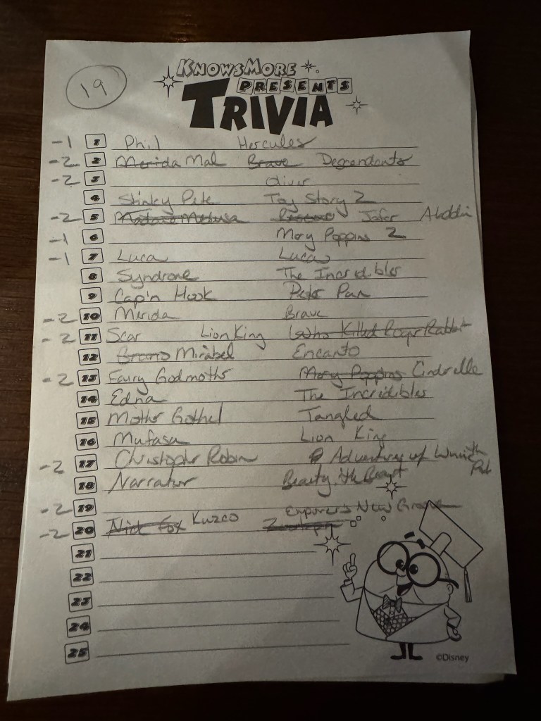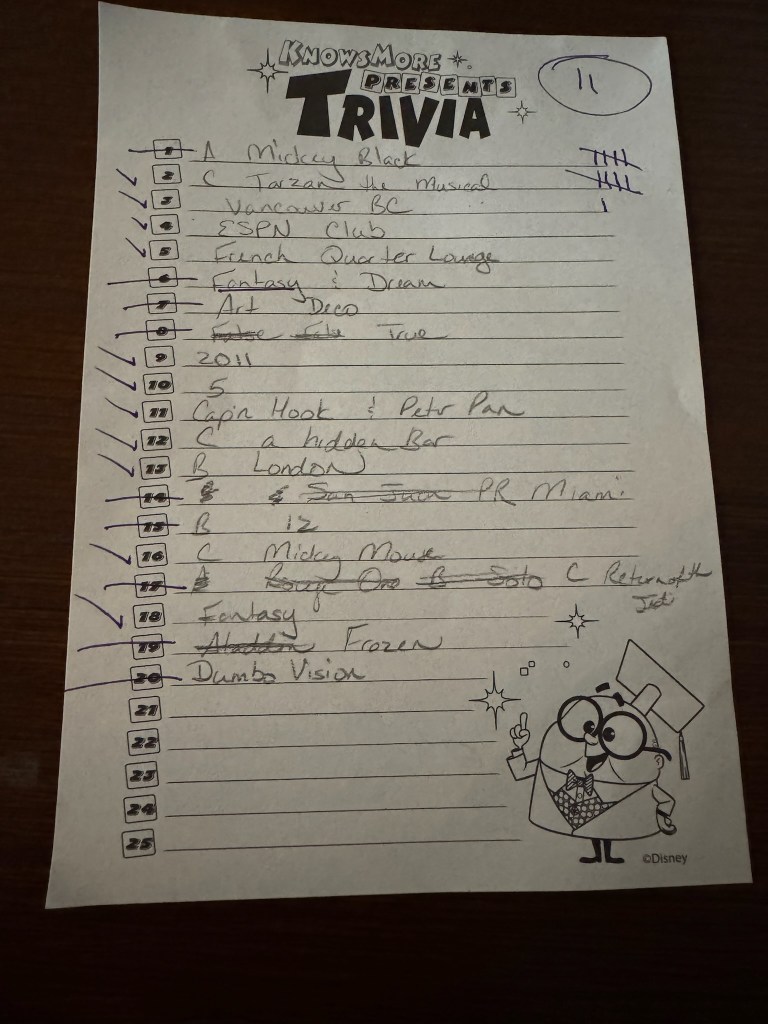 Our games were interrupted by several rounds of trivia. Disney Cruise Line trivia (pretty good), Disney Side Kick trivia (so close!) and Disney Movie Quote trivia (we had fun…).
