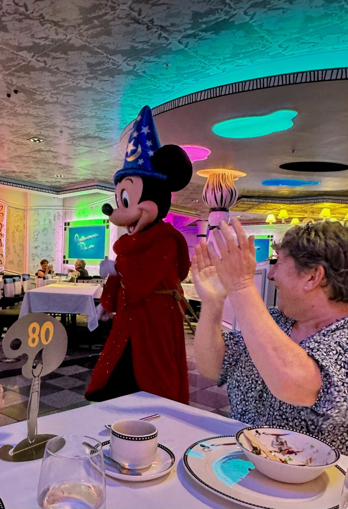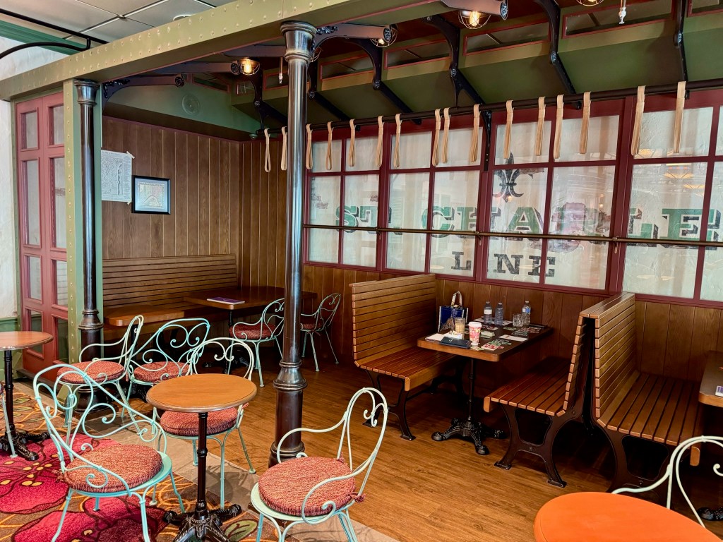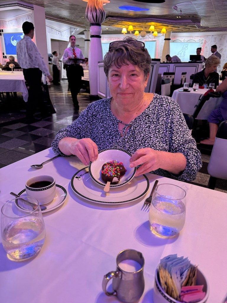 True fact: Mom and I missed the same question on Disney Side Kick trivia that we had missed on the DIsney Wish in January – what do the initials for WallE’s friend MO stand for? We’re working hard at learning Microbe Obliterator. It feels like this question will come up again! The lounge is lovely – we found great tables in the street car for playing games – and they serve fancy coffee!