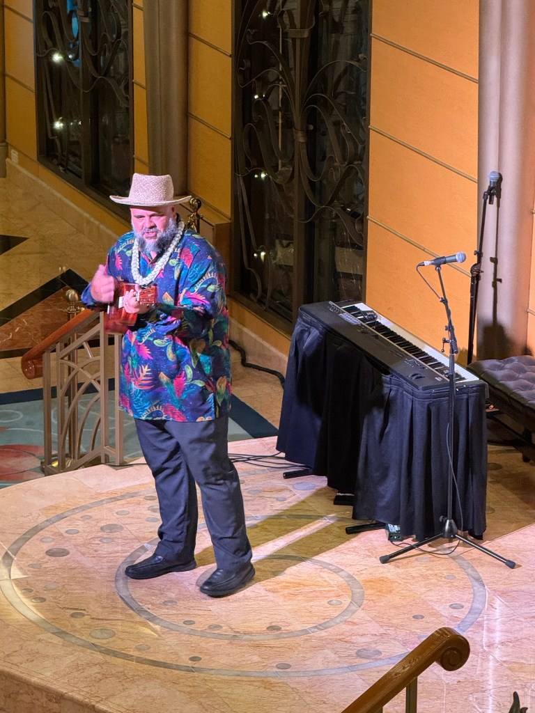Eve went back to start putting together the laundry bag for tomorrow (they’re offering a special, everything in the bag up to 30 pieces for $25 and we’re taking them up on it). Mom and I stayed in the atrium for Storytime with Uncle, who’s from Aulani. He started with the Aulani luau song, then told a story about a man who was being tricked by the Menehune. It was a fun ending to a great first day at sea!