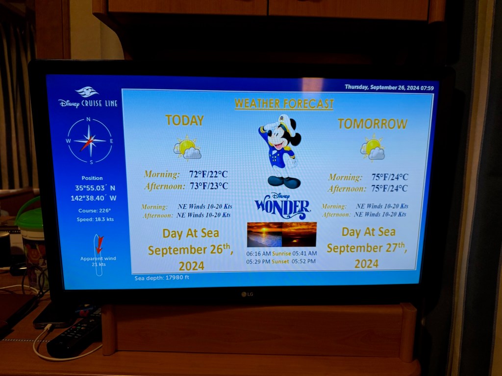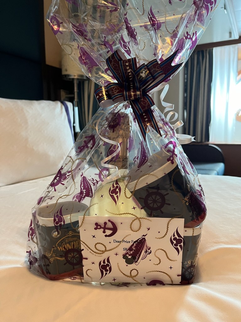 At some point, I went back by the room and found a lovely gift (although a little strange – a bottle of sparkling wine with three Disney Wonder coffee cups), and a note from Guest Services apologizing for the troubles. The only thing we can figure is from the first sea day, when we mentioned a smell in the shower room to Twinkle, but the smell went away and never came back. Both she and her manager had stopped by to check in with us about it later that day. Nonetheless, it was thoughtful and appreciated!