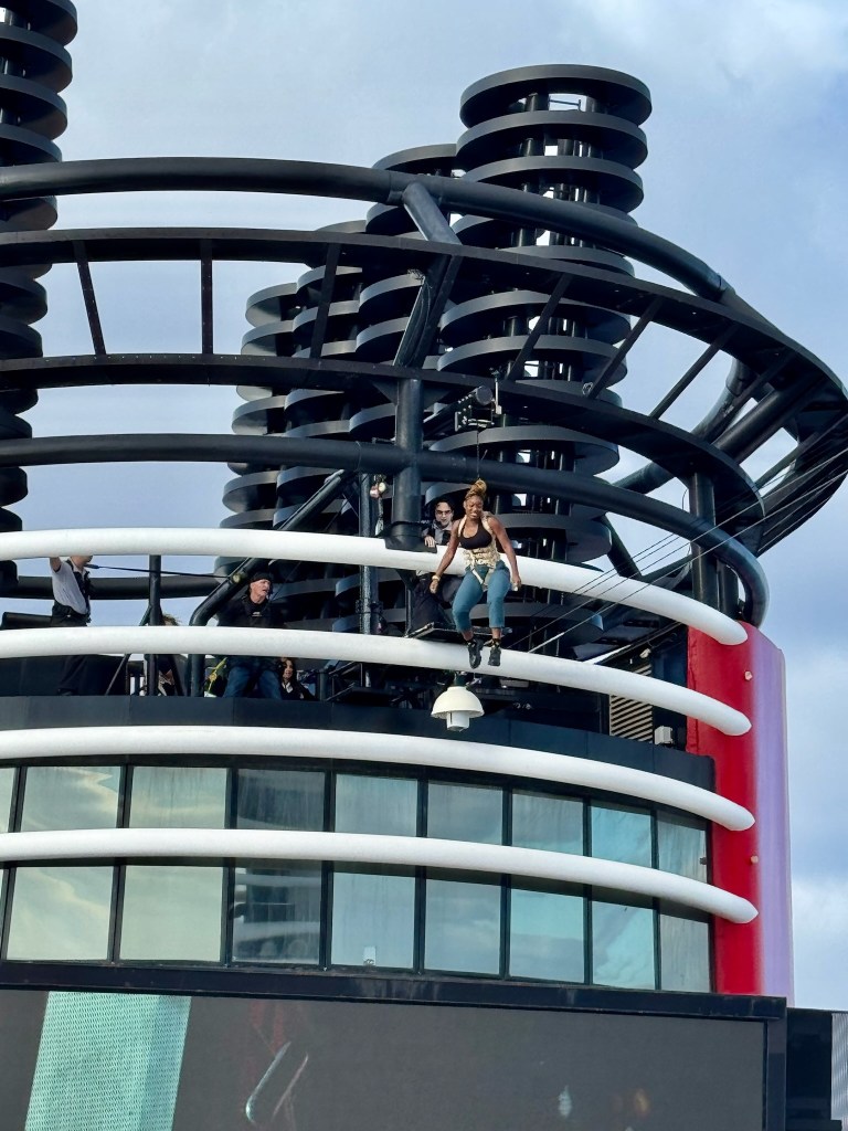 I was the only one up that early since I had a pedicure scheduled. On my way to the spa, I stopped to watch the entertainment staff training on the funnel. They haven’t had a Pirate night in several months, since the Alaska cruises have Frozen night.