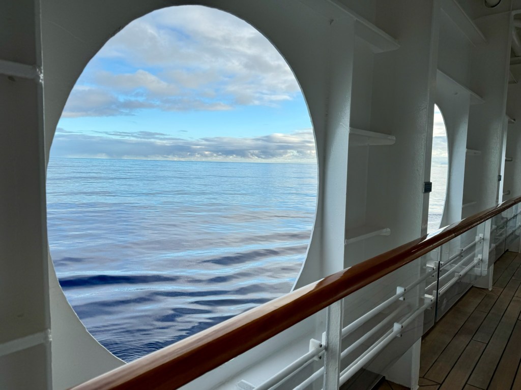 Another lovely day at sea! Unfortunately, my notes have gone into the great digital beyond, so today’s entry won’t be as detailed as the others. But – I do know that another beautiful day dawned in the middle of the Pacific Ocean and I started the day with a walk around deck 10. (Sadly, deck 4 was blocked at both the forward and aft ends of the ship every time we tried to make the loop on that deck.)