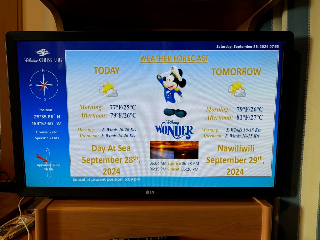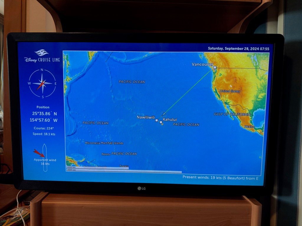After a lovely lunch, we strolled back to our stateroom to get into comfy clothes, then headed out to find a place to play games. The Pub was full (college football was on), so we ended up in the French Quarter Lounge. Shortly after we got there, a DCL Trivia game started – and we won!! 14 questions right!!