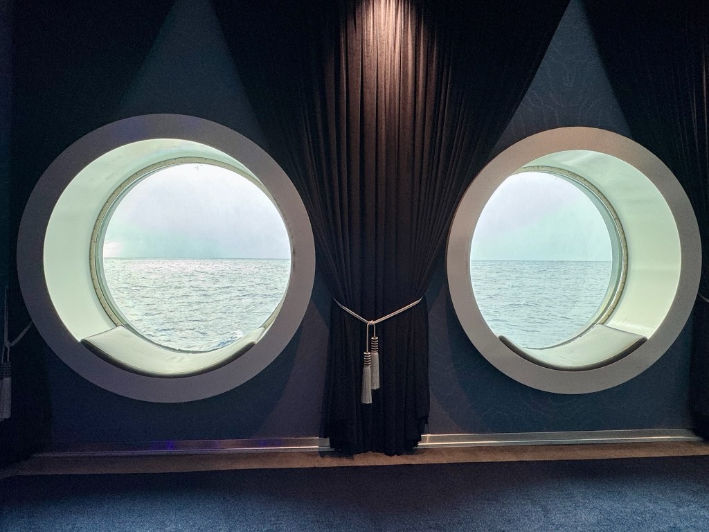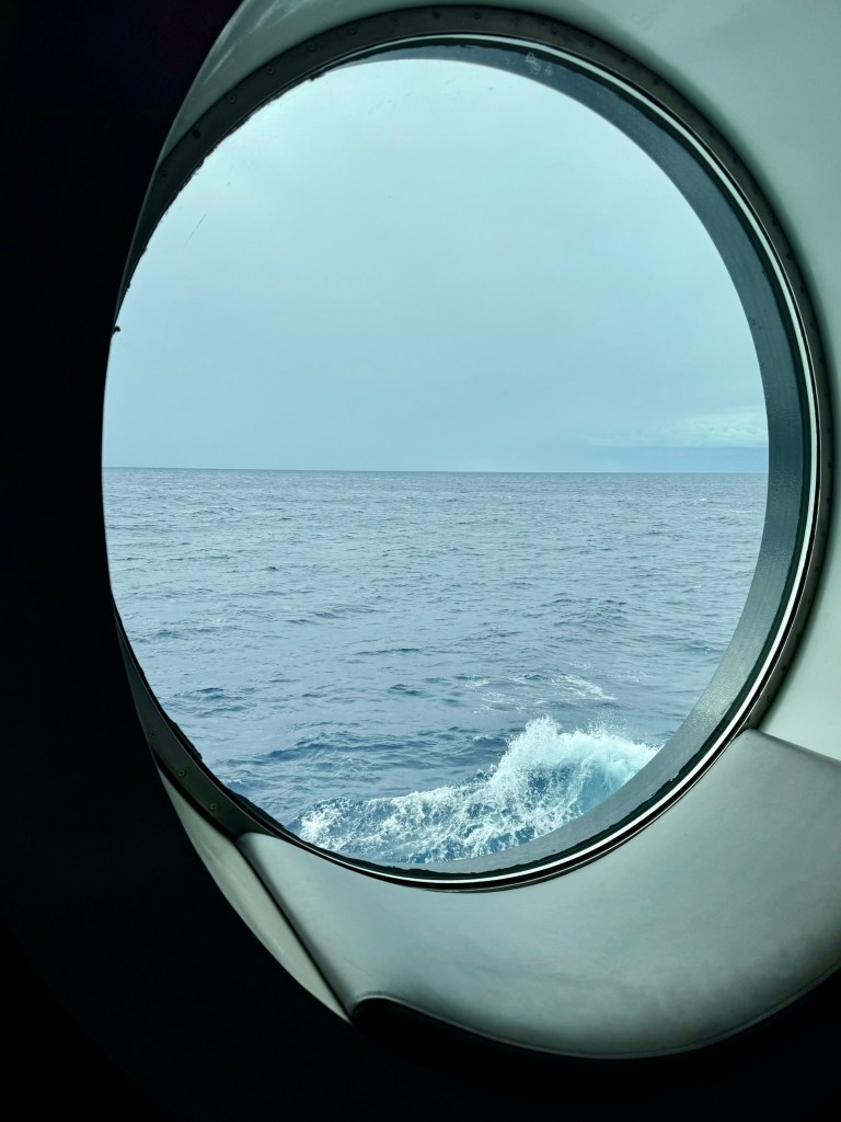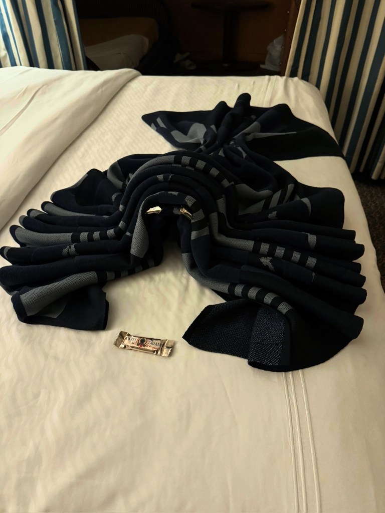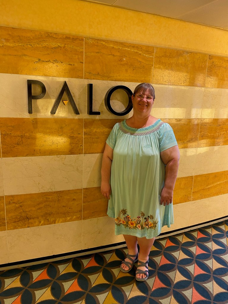 After bingo, we went back to the stateroom to change for Palo brunch. We had an amazing meal, with a beautiful view, and great service from Louise from England. We shared a goat cheese and sun-dried tomato pizza. Eve had the snapper, Mom had the chicken parm (of course!) and I had the veal saltimbucco. I had an amazing apple cinnamon sticky bun for dessert and Mom and Eve both had the chocolate hazelnut melting cake.