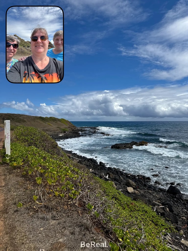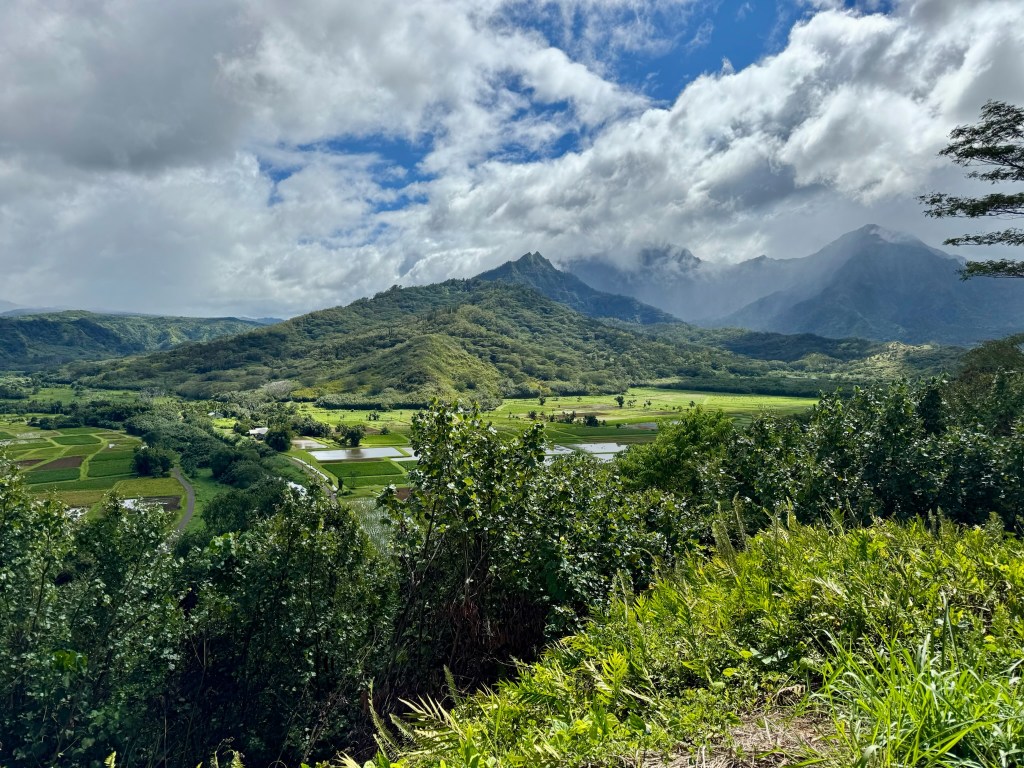 After a lovely lie-in, Eve and I went up to Cabanas for breakfast and delivered breakfast for Mom. Then it was out the door and into a taxi to head back to the airport to pick up our car and off we go! Today we’re taking the Shaka Guide tour of the North Shore. On our way to the starting point, we stopped at an overlook in Kapa’a.