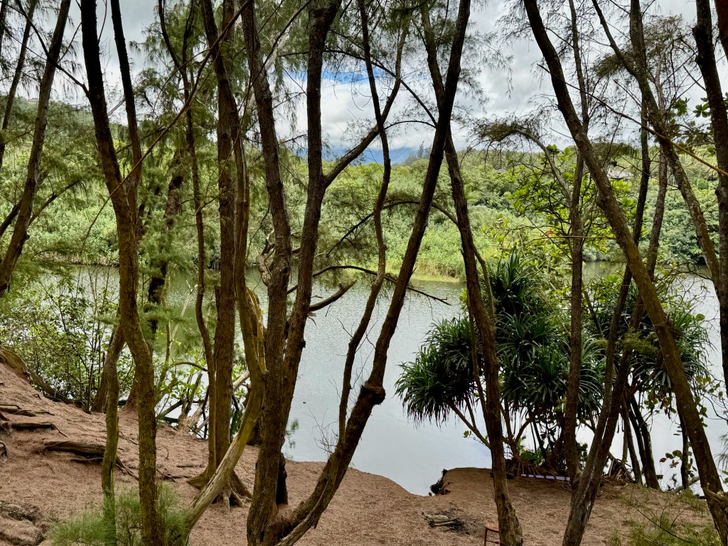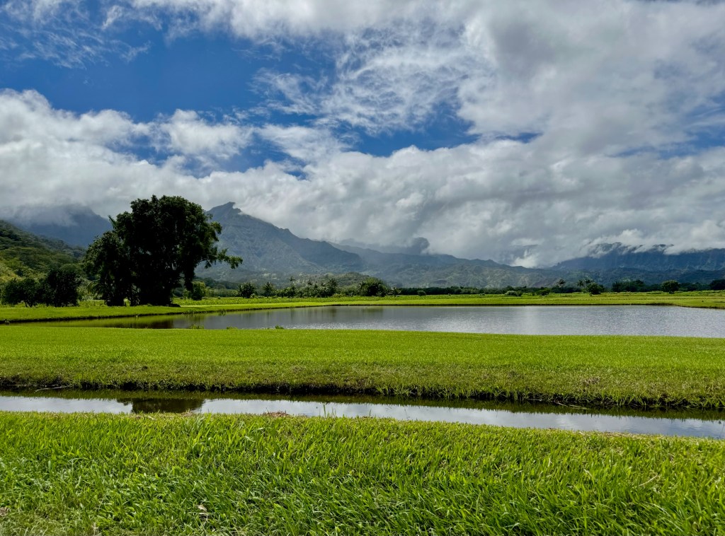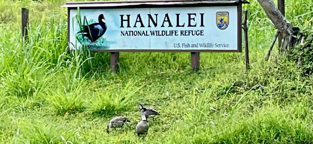 As we continued on, we learned about one-lane bridges. Everyone going one way gets to finish crossing the bridge, then everyone going the other way gets their turn. (I became proficient at them before the day was over!). After crossing the first one, we were told to turn left to head towards the Hanalei National Wildlife Refuge. What he didn’t warn us about is that it is a one-lane road through the middle of taro fields. Thankfully no one came towards us while we were driving through.
