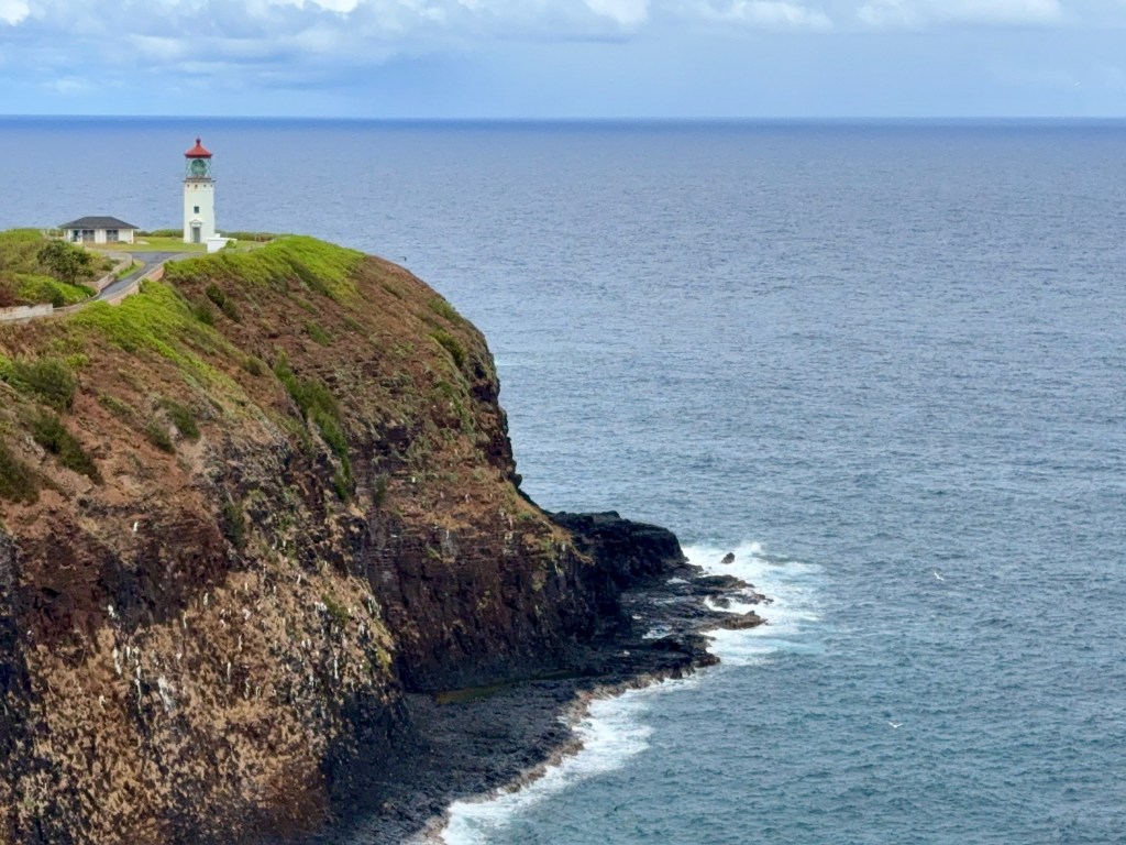 Next stop was the Kilauea Point National Wildlife Refuge and lighthouse overlook. We passed lots of Nene (Hawaiian geese) on the way and saw lots of birds in the air. The Refuge was closed today, so we couldn’t visit. The white specks on the cliffs are all birds!