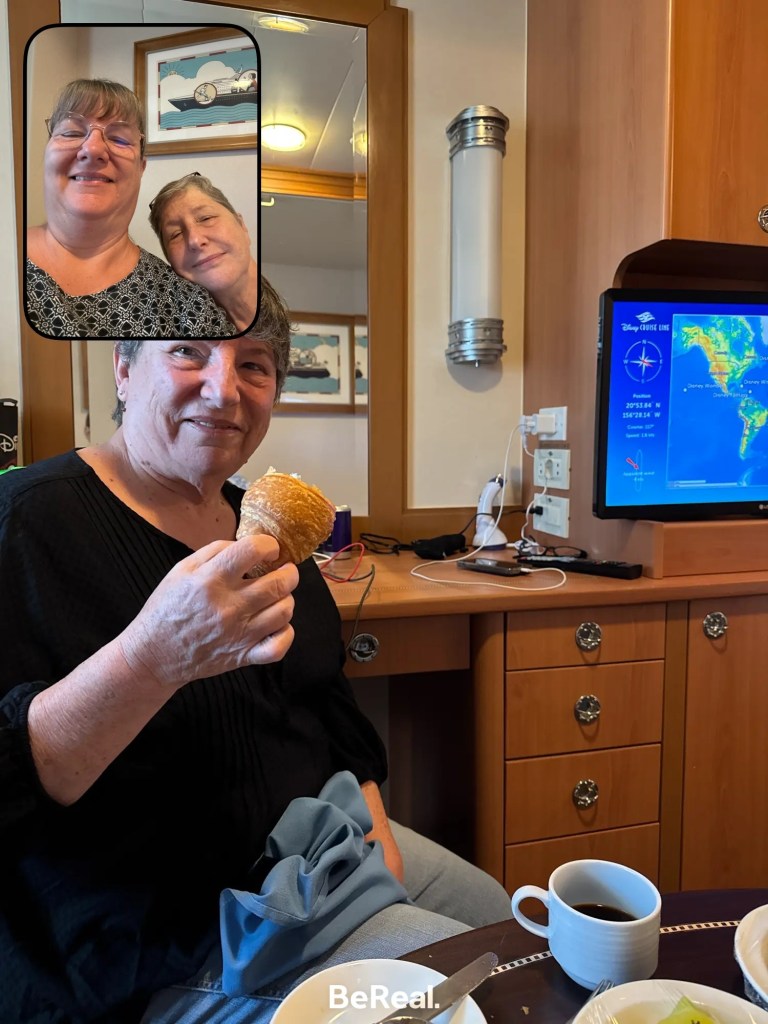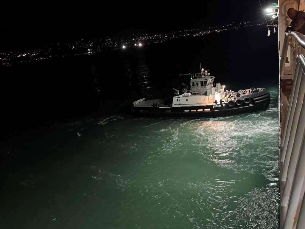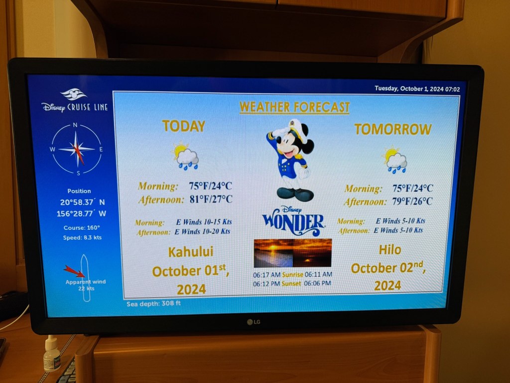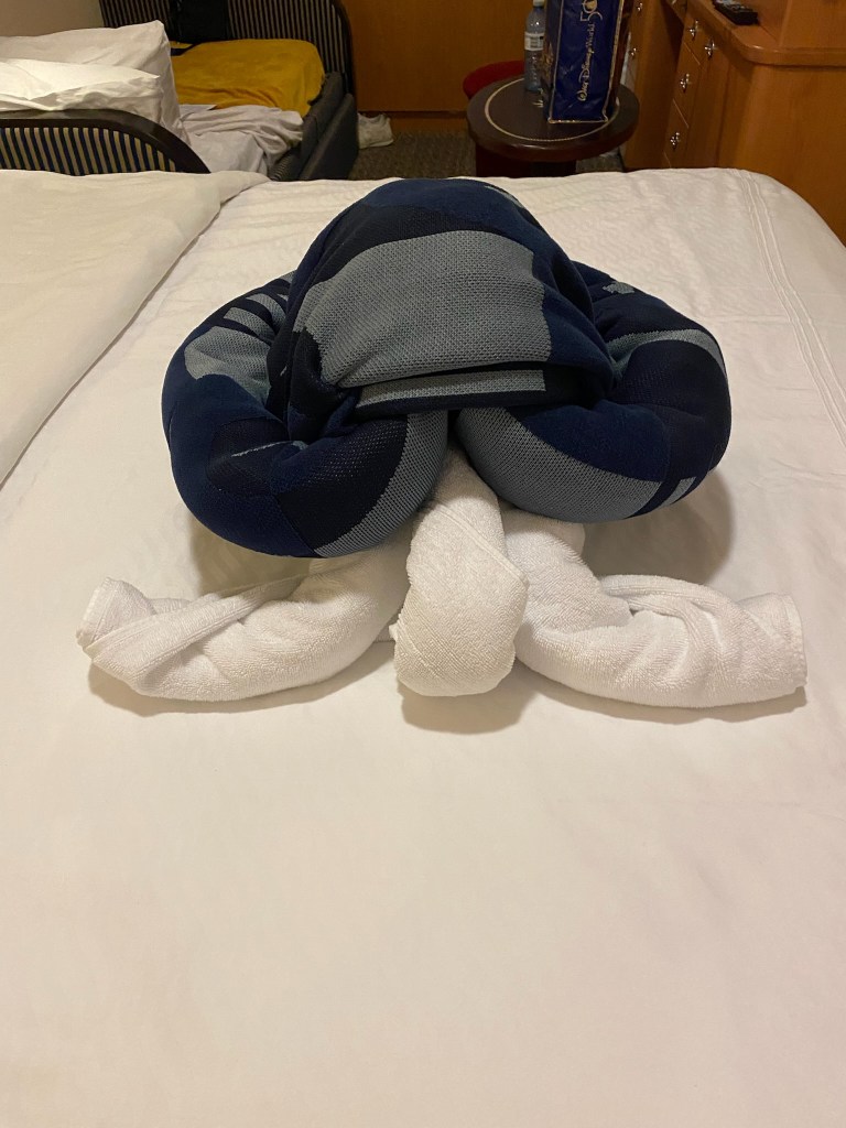 Back on board, we played games in the French Quarter Lounge until sail-away. Mom and Eve went on back to the room, but I went out on deck 4. The tug boats were back again – we’re still not sure what they’re doing, they never actually touch the ship. I also ran into some friends! Chip and Dale told me about their great day ashore. Chip caught some rays while Dale went surfing. They also reminded me about tonight’s session on Wayfinding up on deck 10.