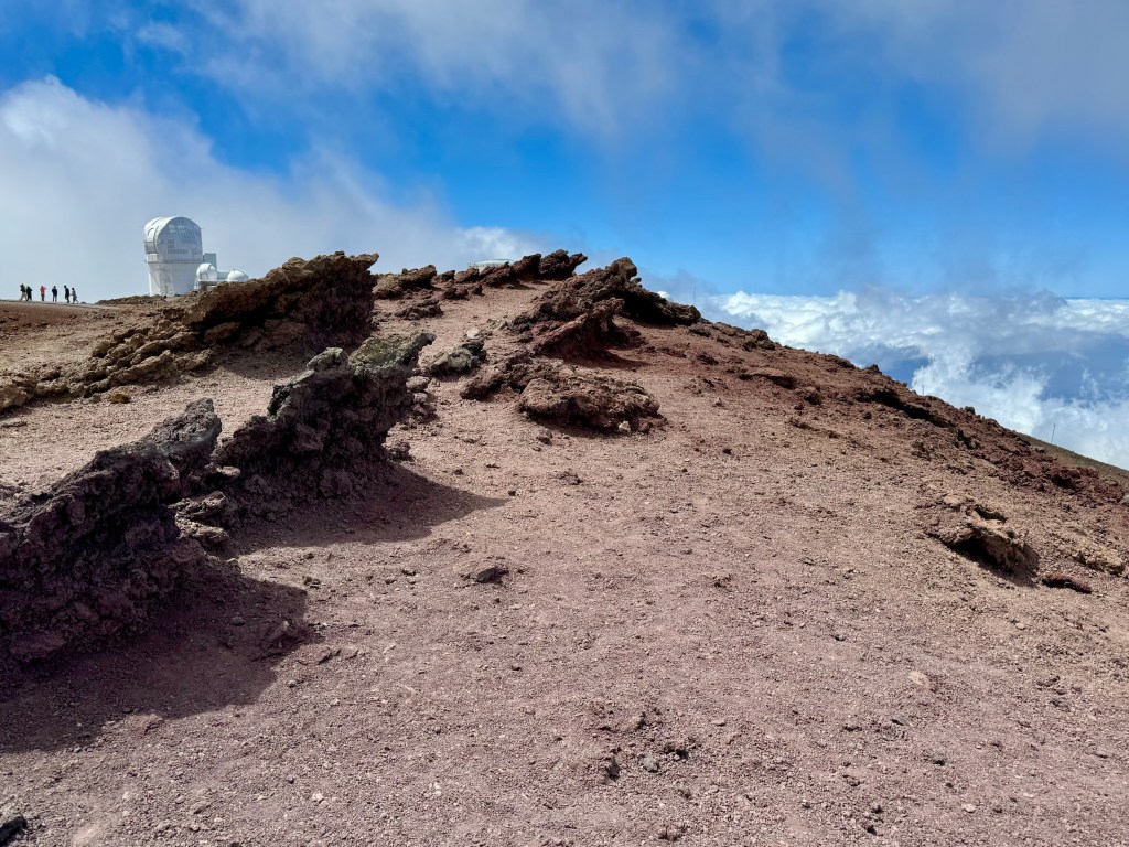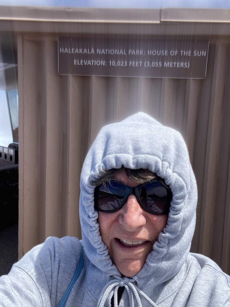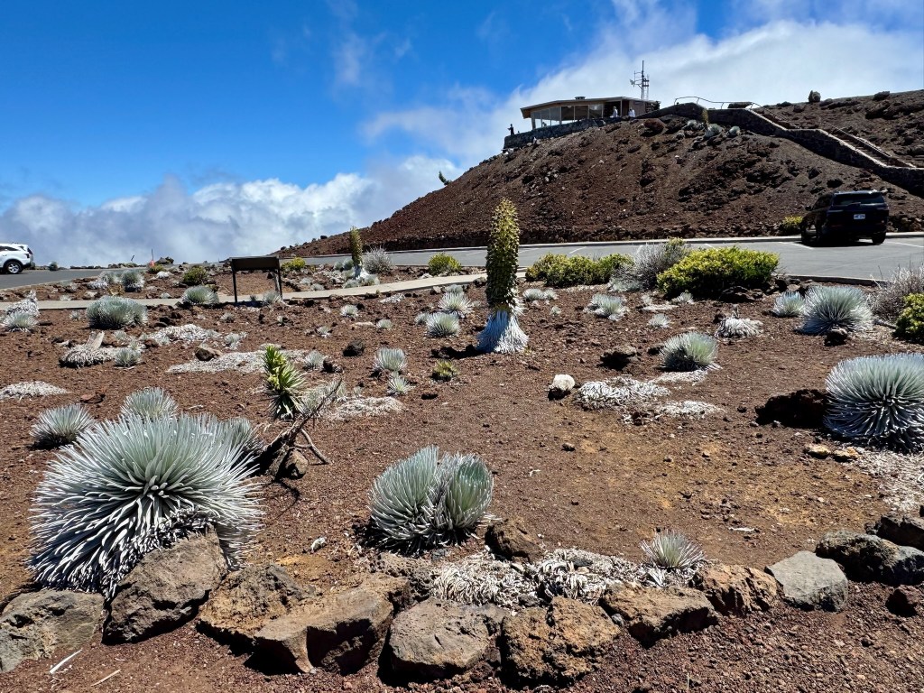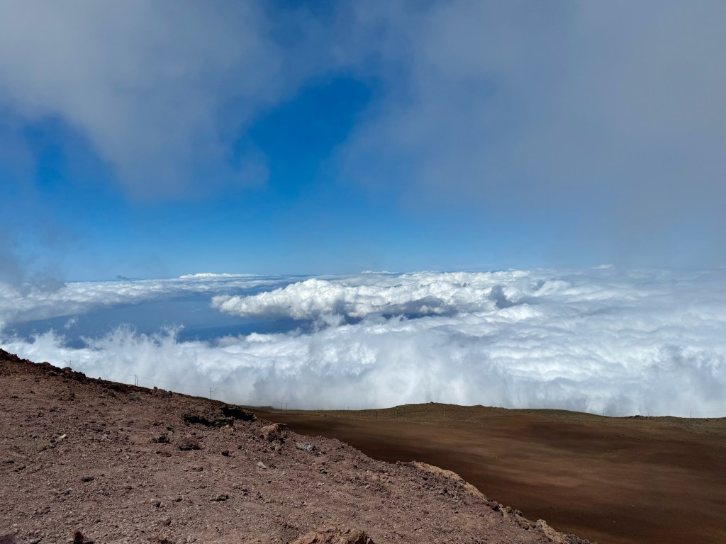 The mountain is almost always ringed in clouds – they call it the mountain’s Lei on Maui. They make for interesting weather – we were in and out of light rain showers, sun showers, and even dense fog during the drive up and down. We drove straight to the summit – 10,000 feet!