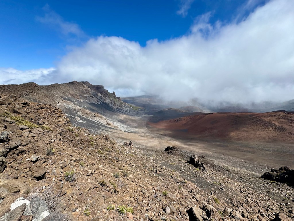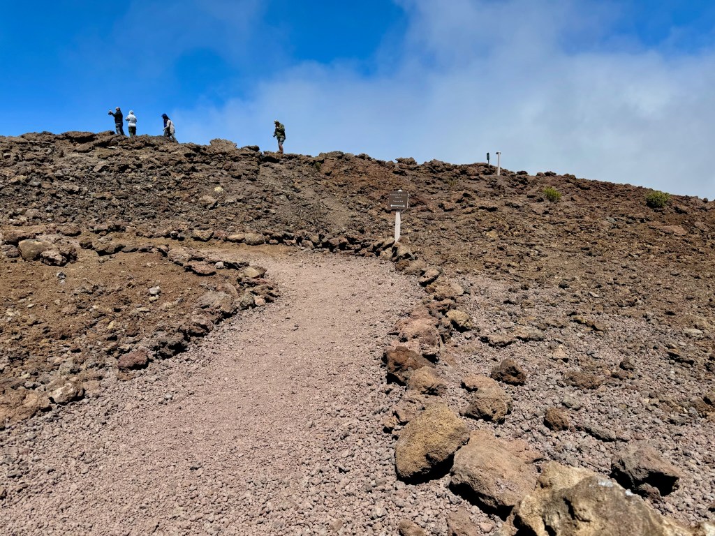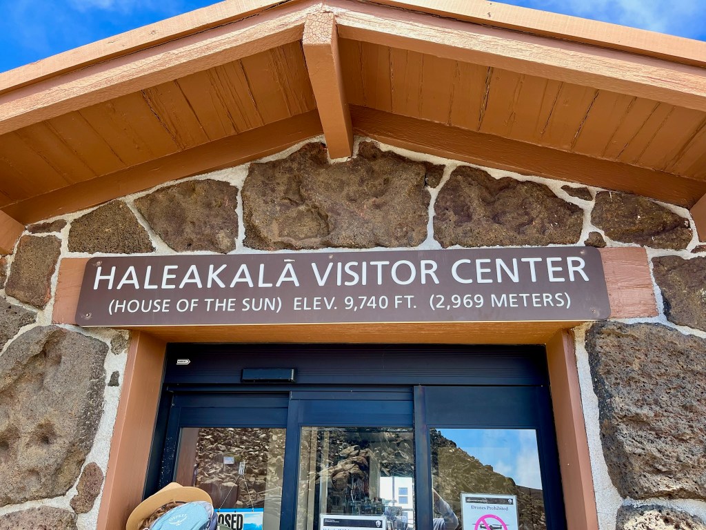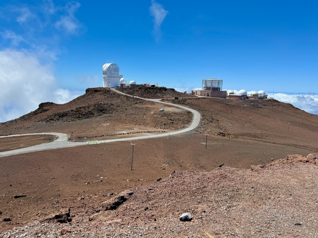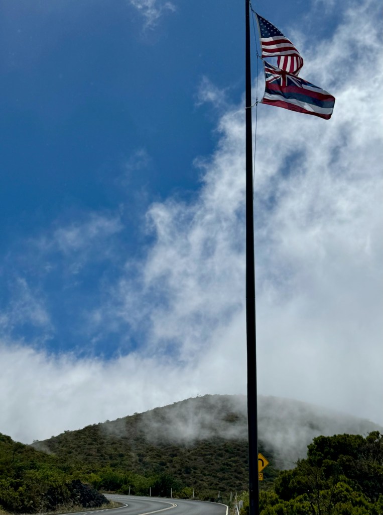The mountain is almost always ringed in clouds – they call it the mountain’s Lei on Maui. They make for interesting weather – we were in and out of light rain showers, sun showers, and even dense fog during the drive up and down. We drove straight to the summit – 10,000 feet!