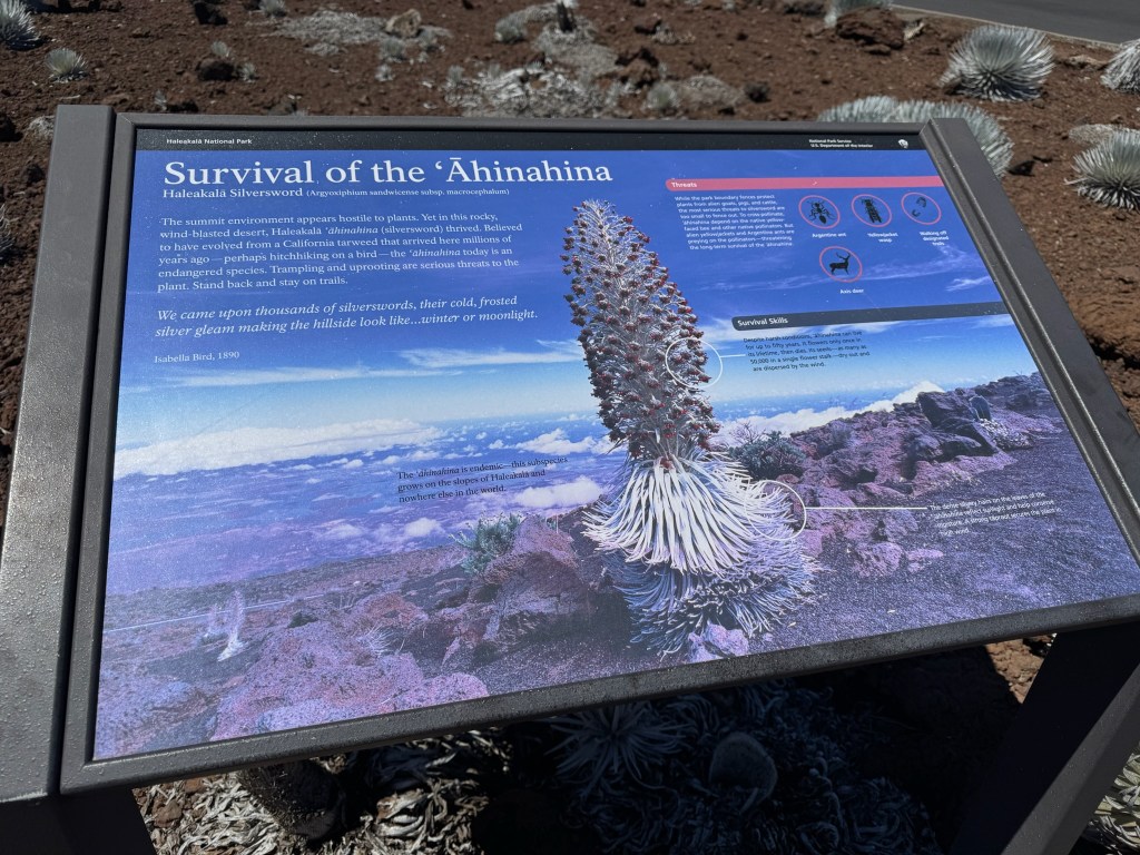 We found several ‘Ahinahina (silversword plants). They are only found in Hawaii and can live to be 90 years old. They bloom once, right before they die, but they can produce up to six feet of flowers.
