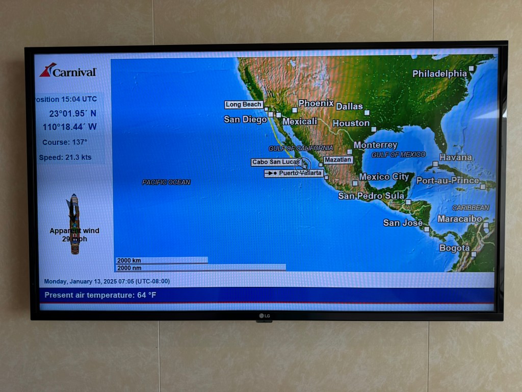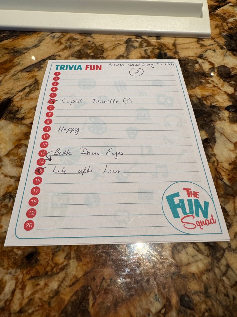 We played games in Ocean View Lounge (and attempted #1 hit song trivia – to date our worst ever trivia showing), but chose to head back to the room instead of staying for karaoke.
