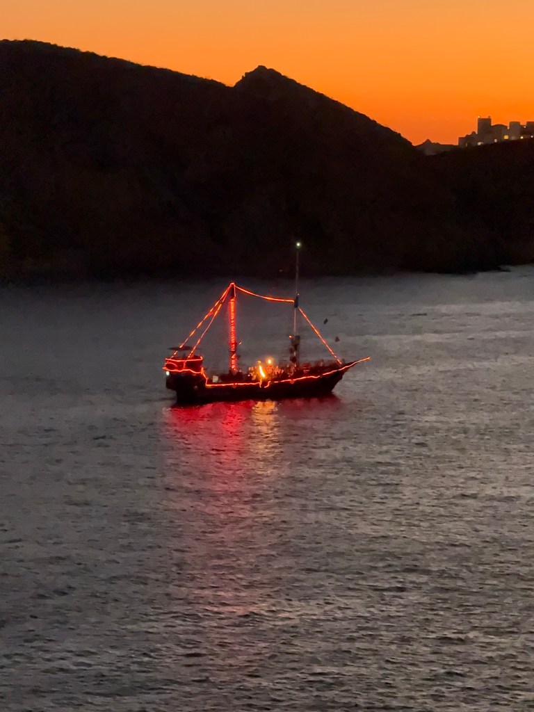 We went by way of deck 11 for some lovely sunset views, and sail away was almost as beautiful. I was especially taken with the pirate ship! They were having quite a party!