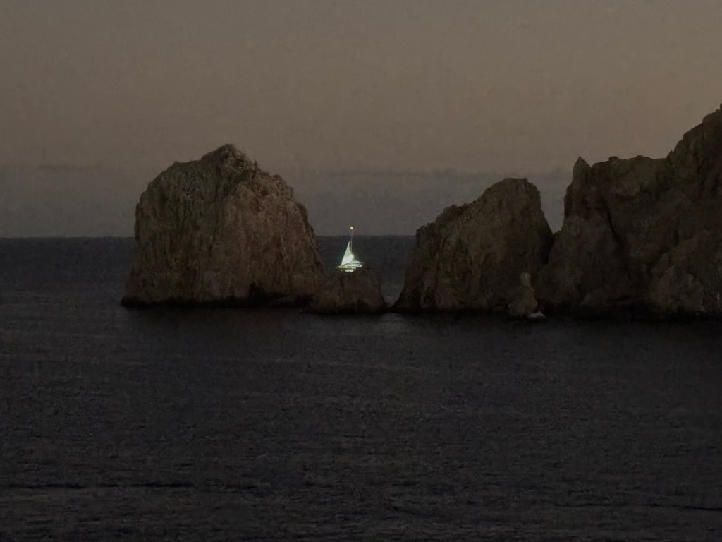 After a little shopping, it was back to the ship for lunch at Guy’s Burger Joint. Mom rested her eyes while I enjoyed the view from the balcony – and all the comings and goings between tenders for two ships and all the little boats doing the Cabo tours.