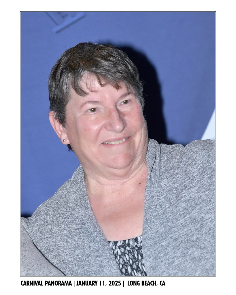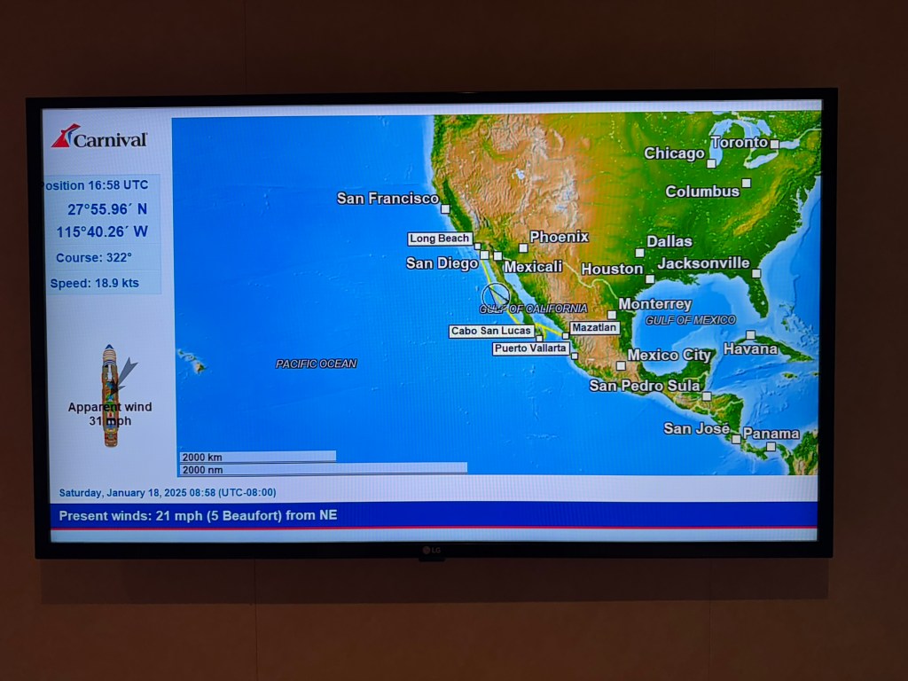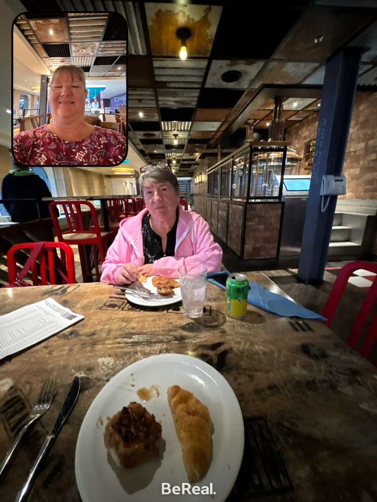 We kept seeing people bringing huge bowls of salads that looked lovely into the area, so we finally asked – they were from the Adult-only area on deck 15, so up we went and got wonderful, made to order salads. We had to bring them downstairs to the buffet to eat because it’s only 55 degrees out and the apparent wind has ranged between 35-50 MPH all day, so the wind chill is colder. (While in the buffet, I may have also gotten a scoop or two of delicious burnt-end Mac-and-Cheese.). After lunch, we decided to do our chores. But after we packed, we played in the casino for a while, then enjoyed a pre-dinner drink at the Havanna bar. It was nice, quiet, and most importantly – indoors! Dinner was a return trip to Guy’s Pig and Anchor BBQ – so good!! After a quick stop to buy a really good pic of Mom, it was time to head back to the room and call it a night. They’re kicking us off tomorrow.