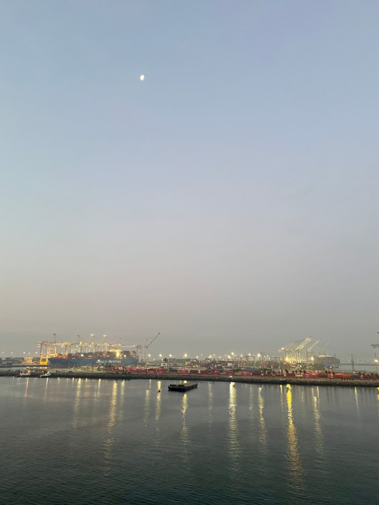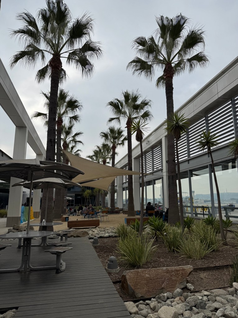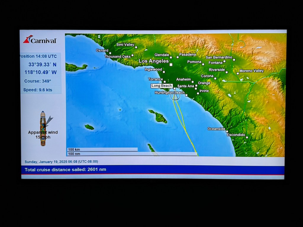 We had a great table at Guy’s BBQ with enough room that we could play games after we finished our breakfast. Our number was called around 9:20 (they had told us to expect 9:30) and from number called to going through security at Long Beach Int’l Airport it took us just over an hour. Disembarkation was superbly organized, the port uses facial recognition, and the porter has cut-the-line privileges for Customs.