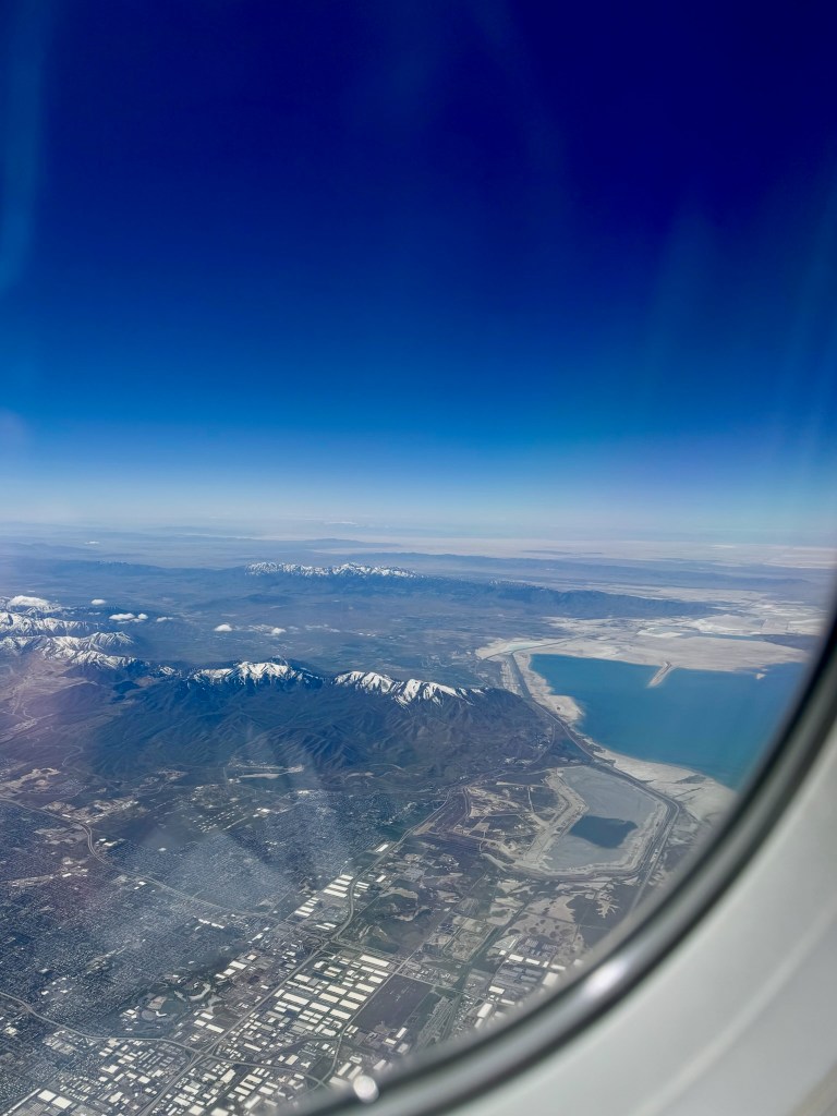 I did still have time for a lovely breakfast at Le Madeline’s before boarding my non-stop flight to Portland! We back out of the gate, head towards the end of the terminal and stop. All flights taking off to the north are on ground stop because of a storm. No estimate on how long we’ll be held. (Not sure it’s helpful to be told that the flights taking off to the south are still allowed to take off – couldn’t we take off that way and make a big u-turn in the air?). Still, I’d rather be safely on the ground if they’re concerned about us taking off in a thunderstorm. After about 45 minutes, the engines were turned back on and we were in the air about 15 minutes later! It was a really smooth flight with some lovely views! Snow in Colorado,