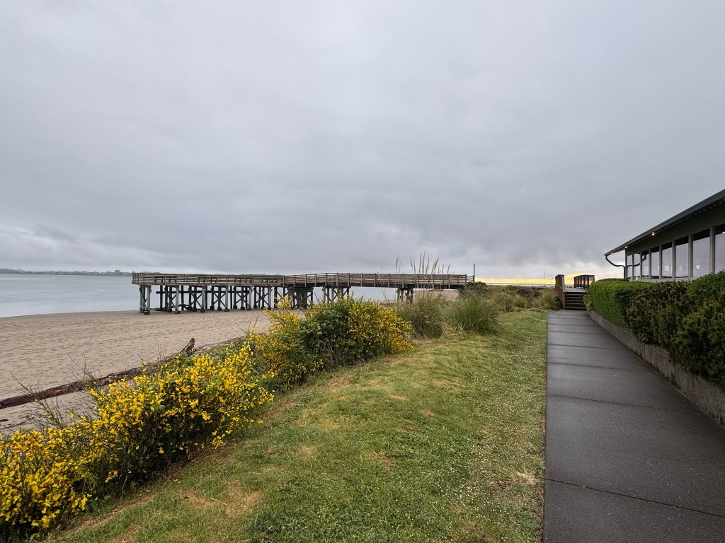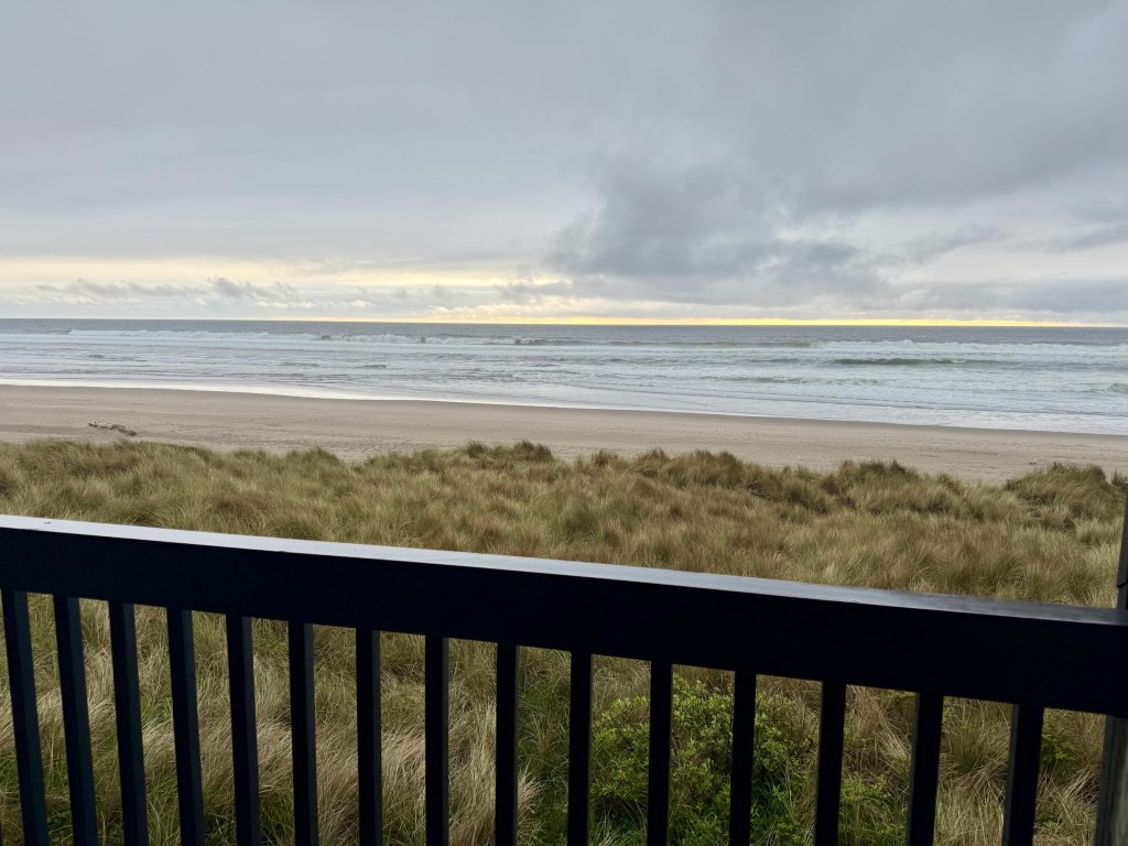 We made it to the Lincoln City Sands, our hotel for the weekend. The front desk agent was lovely, offering us hot seafood chowder and chocolate chip cookies and our choice for a first or second floor room (we chose second, which she recommended because the grass could be too tall to see over if you sat in the chairs on the balcony). The room is HUGE!! It’s a full one-bed, two-bath apartment with a Murphy bed and full kitchen in the living room.