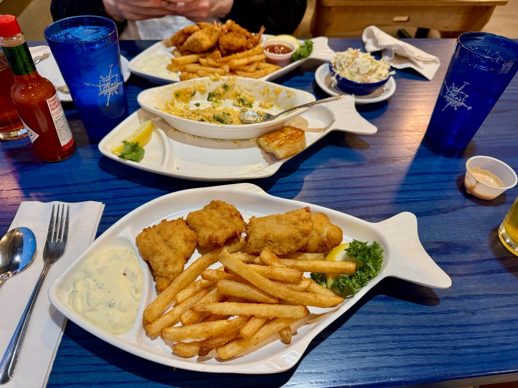 Time for a second appetizer! Shrimp and artichoke dip, with the most amazing Parmesan toast to eat it with. We both also enjoyed a local beer with our meals – Bekah had the combo platter (fried shrimp, cod and clams) and I had the fish and chips. It was crispy and yummy! It was a great birthday meal! Thanks again, Bekah!!