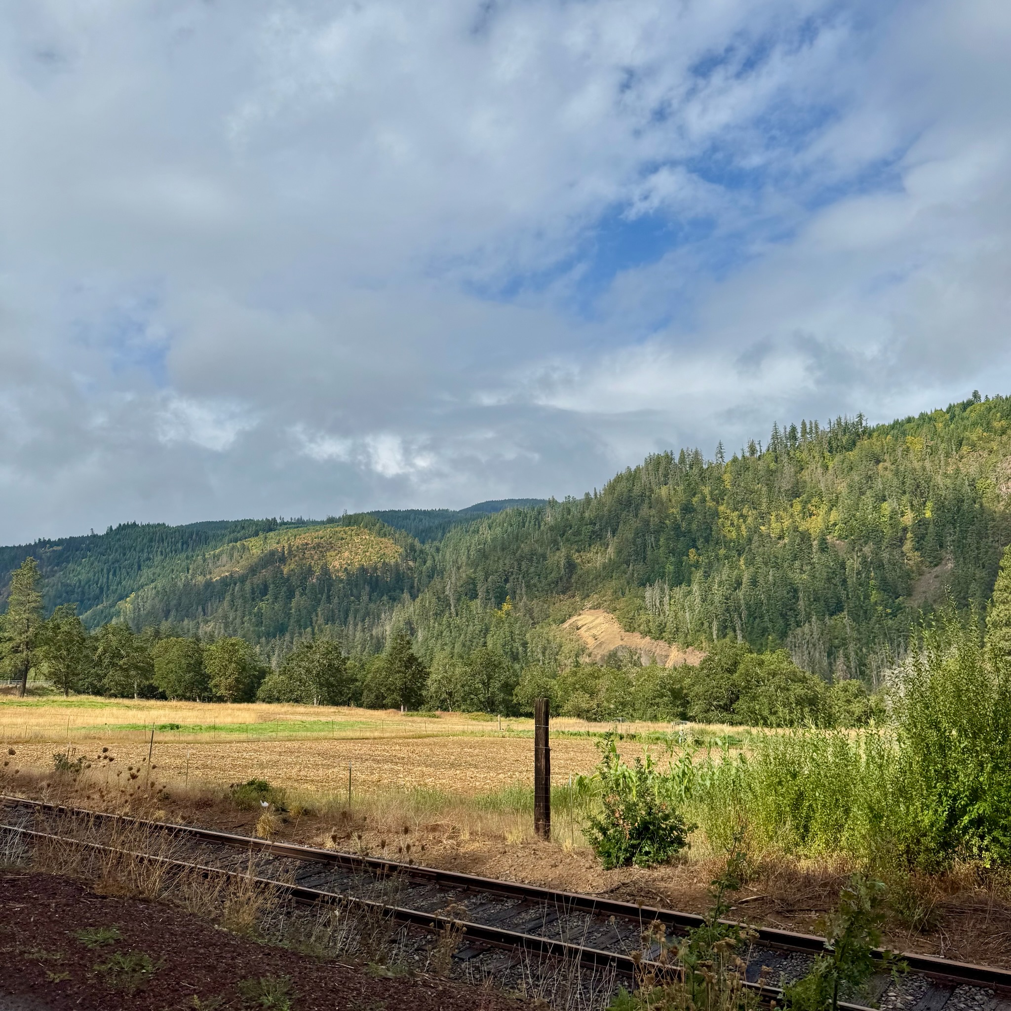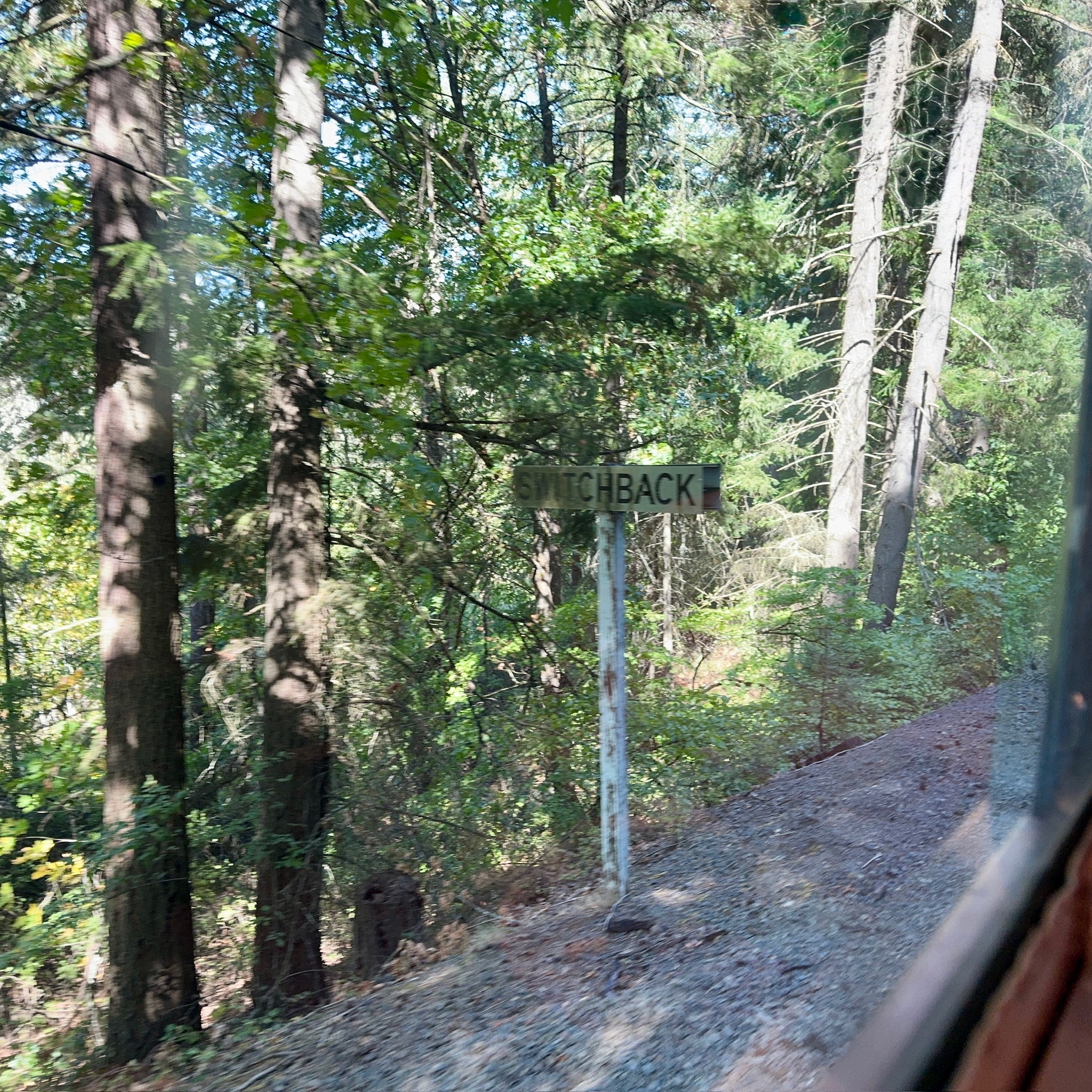 After a rousing “All Aboard” we loaded onto our car and soon enough, we were off! Going backwards… But it didn’t impede the views! The hostess for our car gave us each a package of chocolate covered cherries that we tucked back for later and we settled in to enjoy the ride along Hood River. About 20 minutes along, the train came to a stop for a switchback, suddenly we were going the other direction, up the mountain!