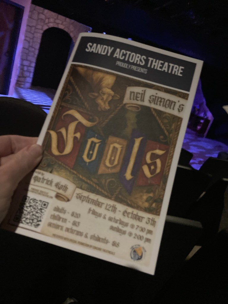 Dinner was at Bigfoot Growler in Sandy, OR. It’s a Thai Mexican place (yes, that’s right). We shared spring rolls (ick), crispy Brussels sprouts (yum!) and Parmesan tots (AMAZING) for appetizers. Bekah got Thai Drunken Noodles and I had pork Carnitas nachos for entrees. It was a nice meal – I’d go back again, but I think I’d make a meal on apps! We went for a cup of coffee after dinner, sneaking in right before they closed for the evening. Then we were off to the Sandy Actors Theater for their performance of Neil Simon’s Fools.