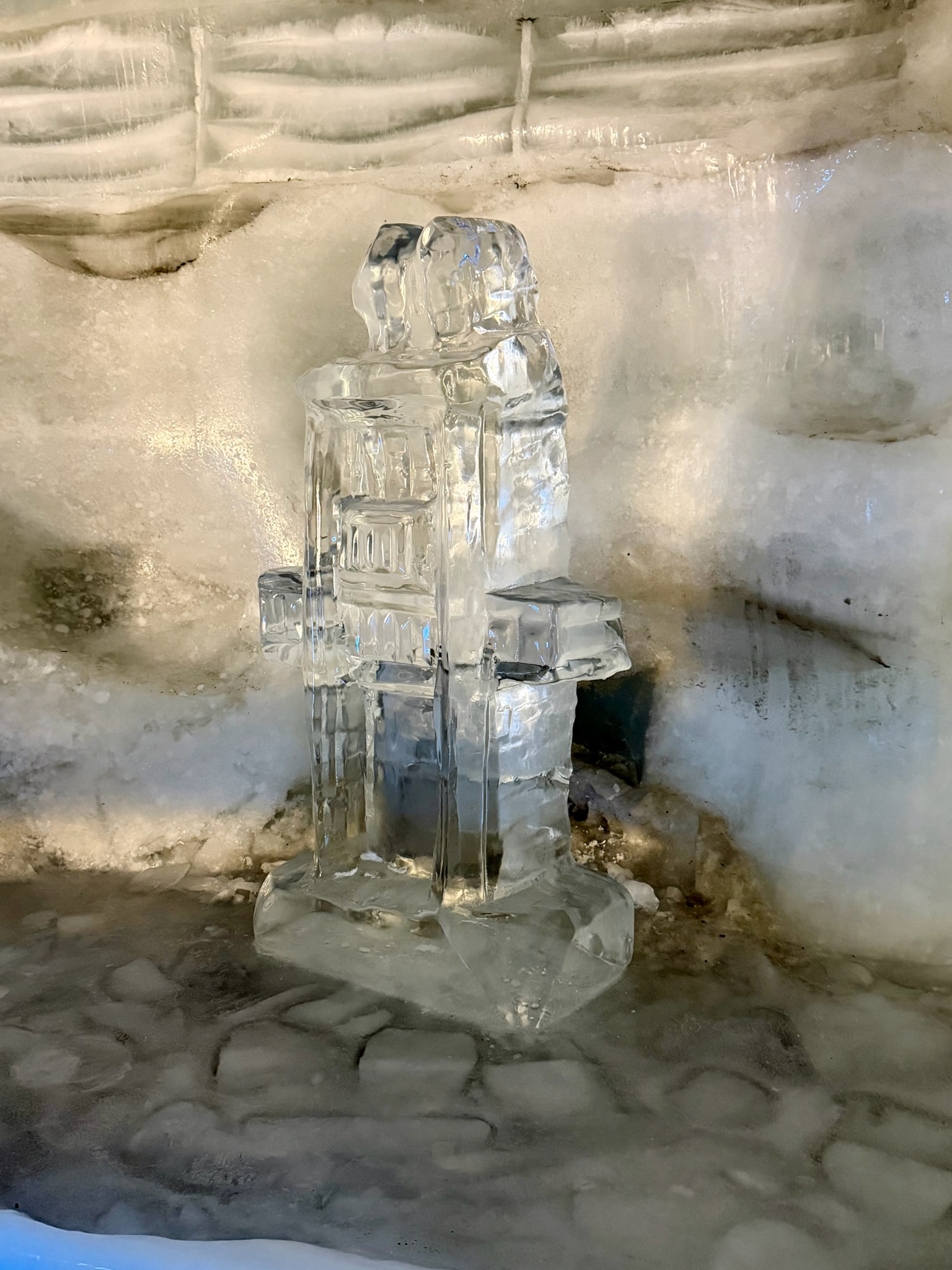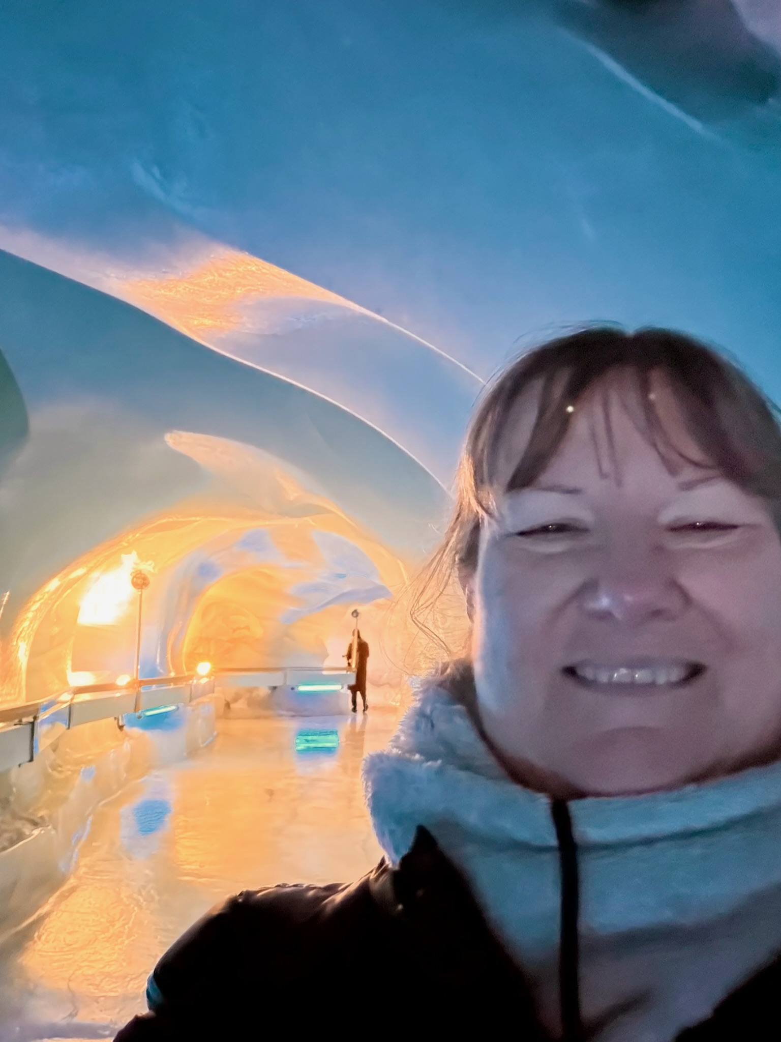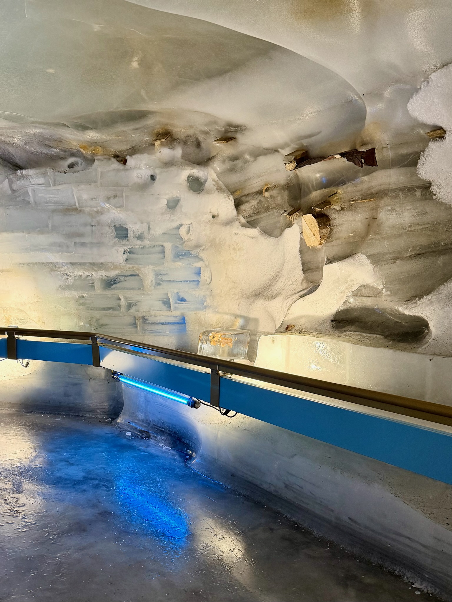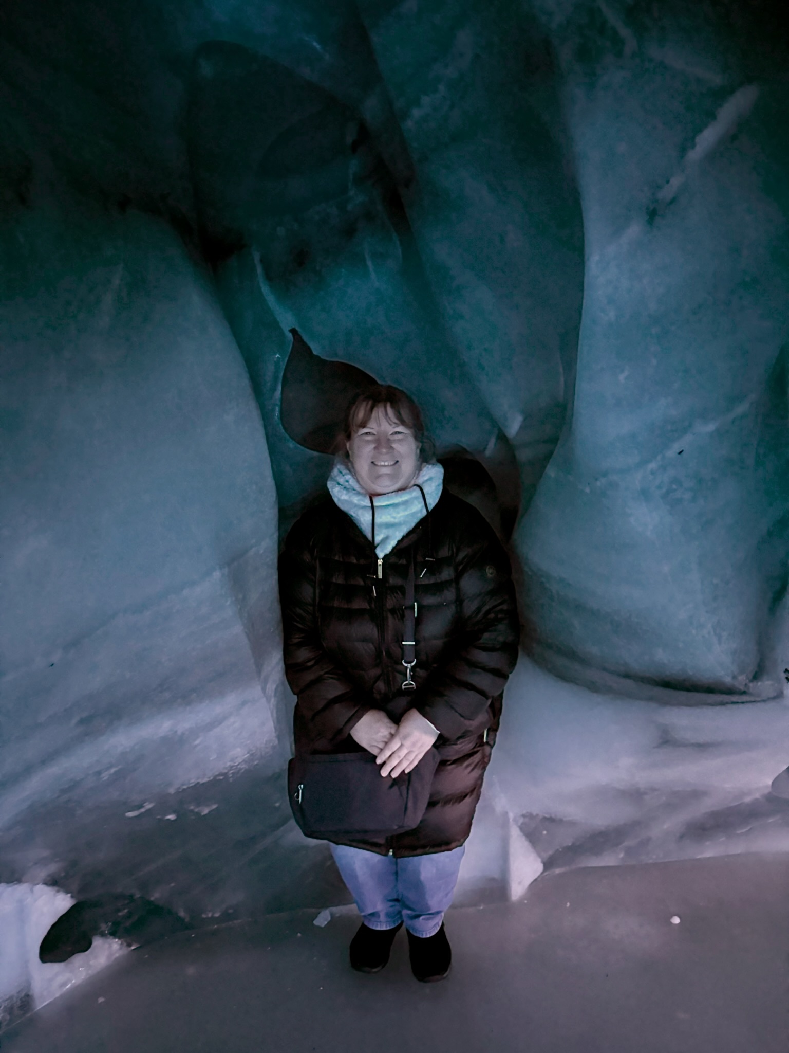 I did enjoy the Glacier Cave – a tunnel cut through the glacier, with some ice sculptures. You have to watch your step, it’s slippery! (Mom decided not to risk her “aftermarket parts” on the ice.)