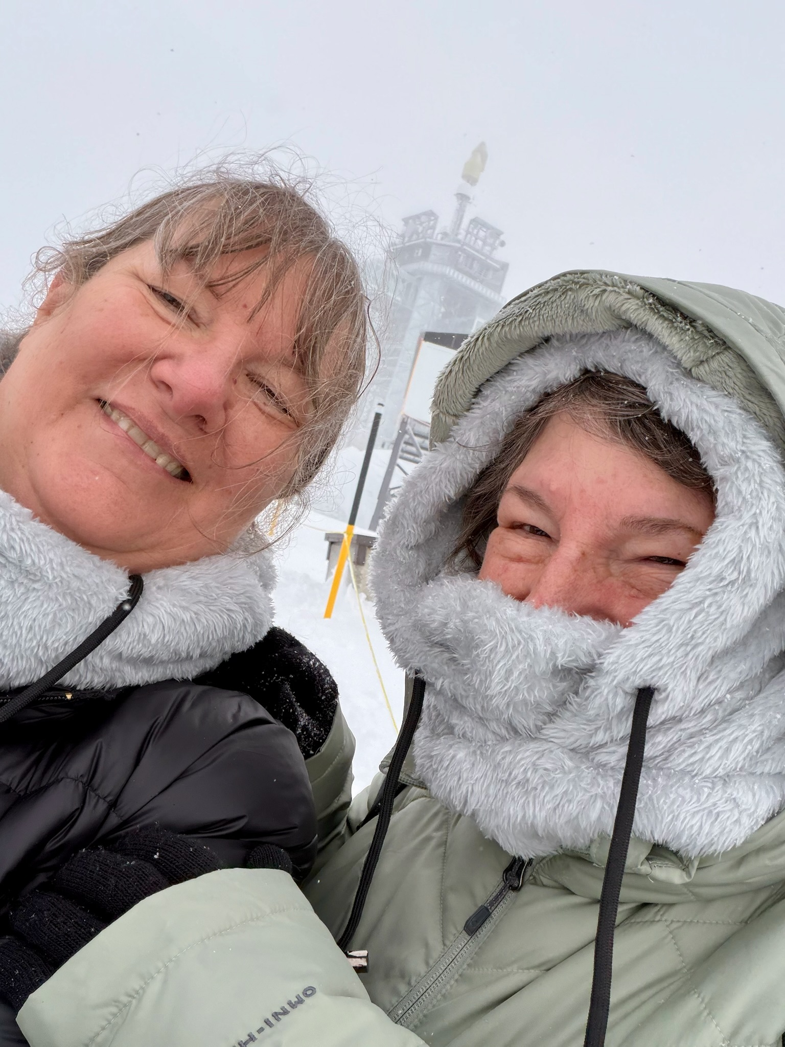 I met back up with Mom and we headed up to the top of the observation building and outside into -7 degree Celsius temperature (approx. 19 degrees F). But more importantly – into the SNOW!!! It was officially snowing!!