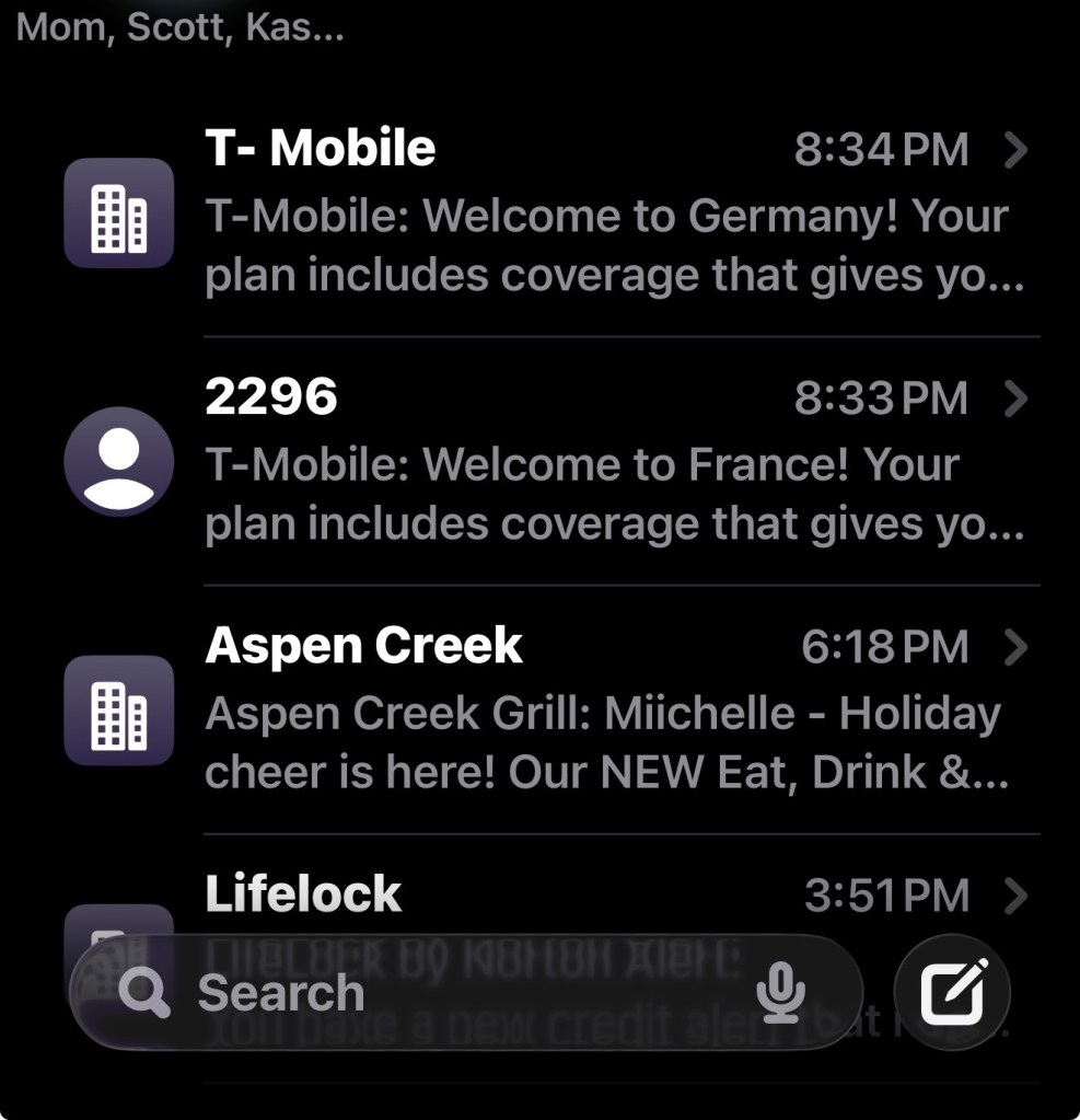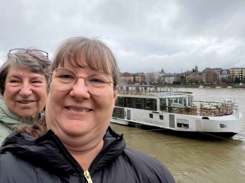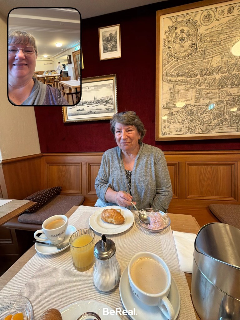Tonight we sat with a family of ladies traveling together – Mom and one daughter live in California, the other daughter lives in McKinney and her daughter-in-law lives on Oahu. They all arrived from various places today. Mom and I both decided to go with the Regional Specialties Menu for dinner: Wurstsalat, Rösti, and a Plum Tart. I remember the Abels (my second host family in Germany) making Wurstsalat regularly (although I still pick out the raw onion). We enjoyed the Rösti so well on Mt Titlas that it was an easy pick for an entree. And the Plum tart was very good! After dinner we stopped for a quick Be Real picture, a cup of coffee (which, strangely they didn’t offer with dessert tonight) and made our way back to our stateroom.