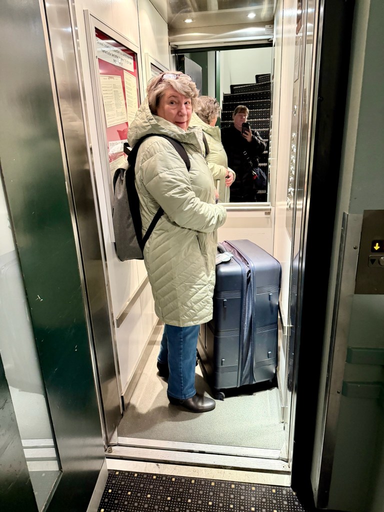 Ack to The Ordeal. Somehow we have to get all our luggage on the tiny elevator and back down to street level to meet our driver at 11. This was further complicated by the rain, so we didn’t want to use the back entrance with only 8 steps as it required walking outside and around the buildings. Step one accomplished – luggage in the lobby!