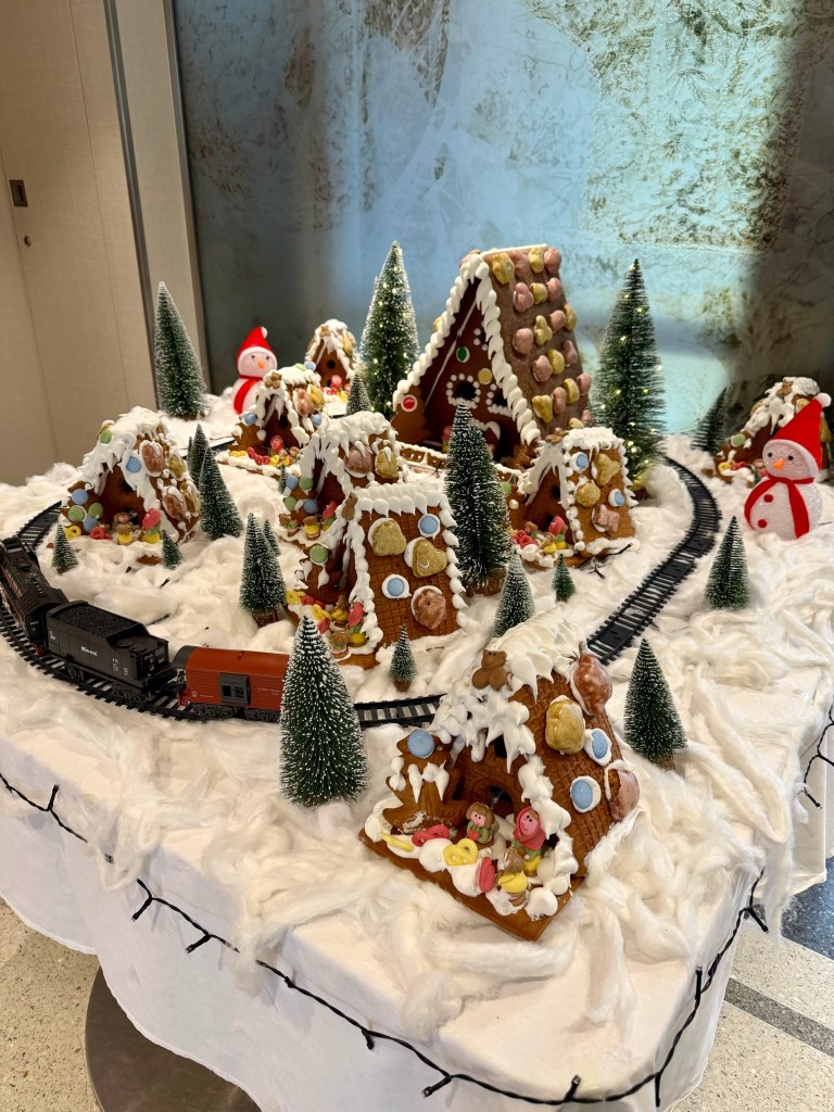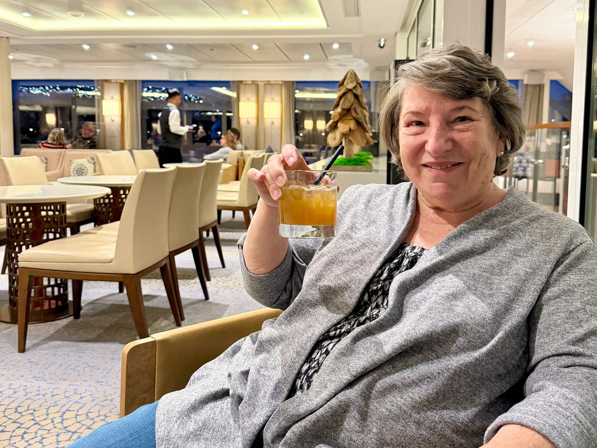 Paolo, one of the dining room servers, met us at the car, took us in hand and got us unloaded so efficiently the driver’s head was spinning! The Einar is bigger than I expected, but still tiny compared to an ocean cruise ship. She’s decorated for Christmas!