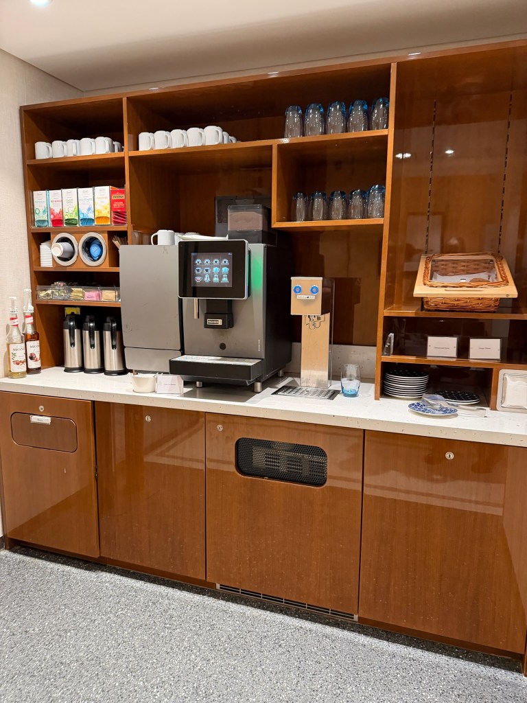 After lunch, we went up to the lounge on deck 3 for a coffee while we waited for our stateroom to be ready. They have wonderful coffee machines that are available all the time! They make coffee, cappuccinos, espresso shots, lattes and macchiatos – all at the press of the button. There are caramel and hazelnut syrups, several kinds of sweeteners and about 8 types of tea bags available. Before dinner, there are also cookies and pastries, too.