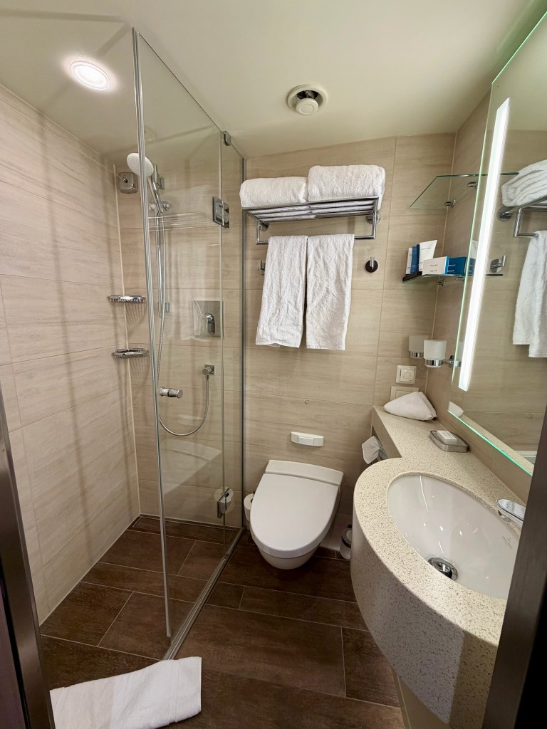 It’s finally, officially cruise day! We had a leisurely morning of breakfast and packing, all gearing up to The Ordeal. (Another side note on the hotel – they have a coffee and tea bar in the lobby – however, it turned out to be an urn of hot water, tea bags and instant coffee, with no way to measure how much instant coffee you were getting out of the container.) Bonus pics of the room!