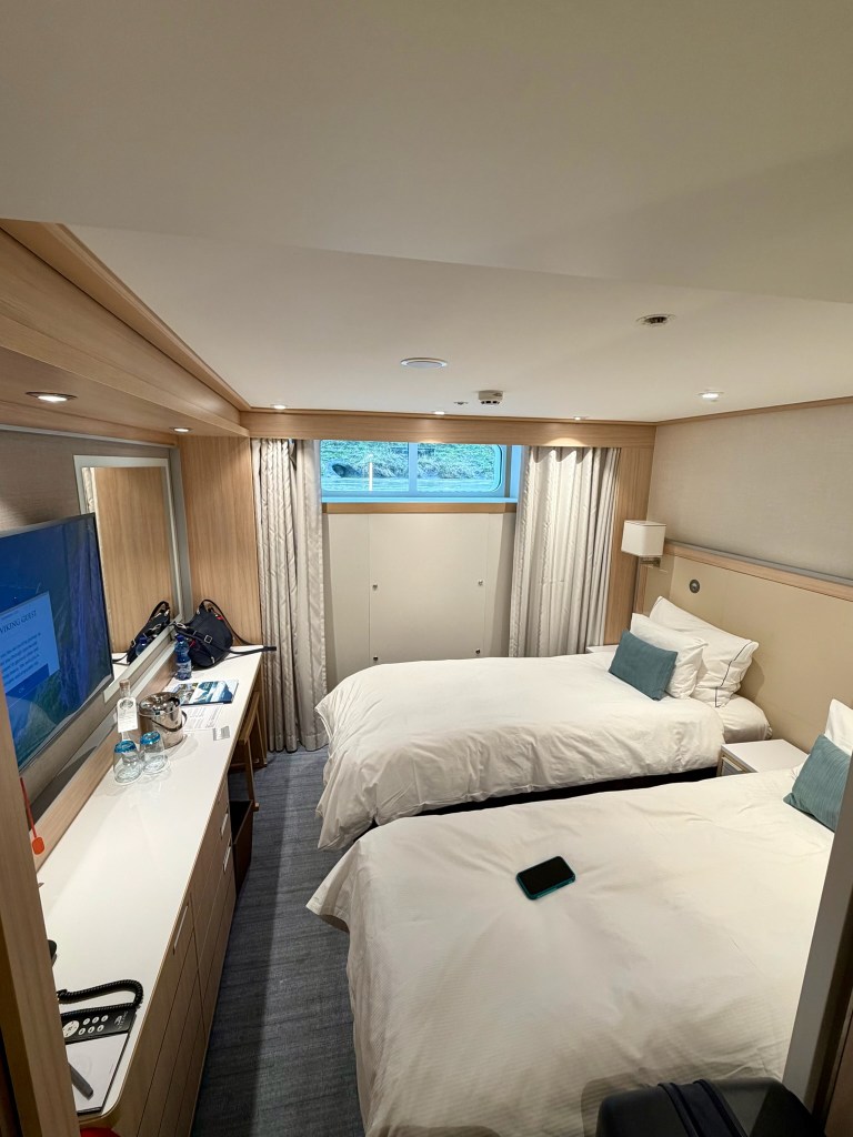 Claire, one of the restaurant servers, found us to walk us to our room. We stopped by the front desk on the main floor to pick up our keys and she walked us down to show us the room. It’s small – but we fit well. Even being prepared for it, the window was a bit of a surprise when we first saw it. But it lets in plenty of light. We also met Laura, our amazing stateroom hostess for the week.