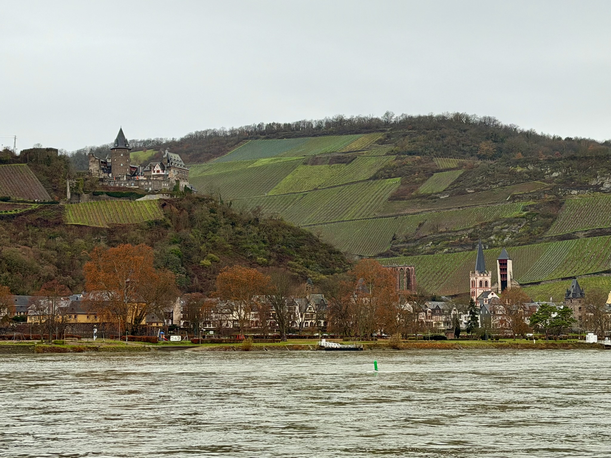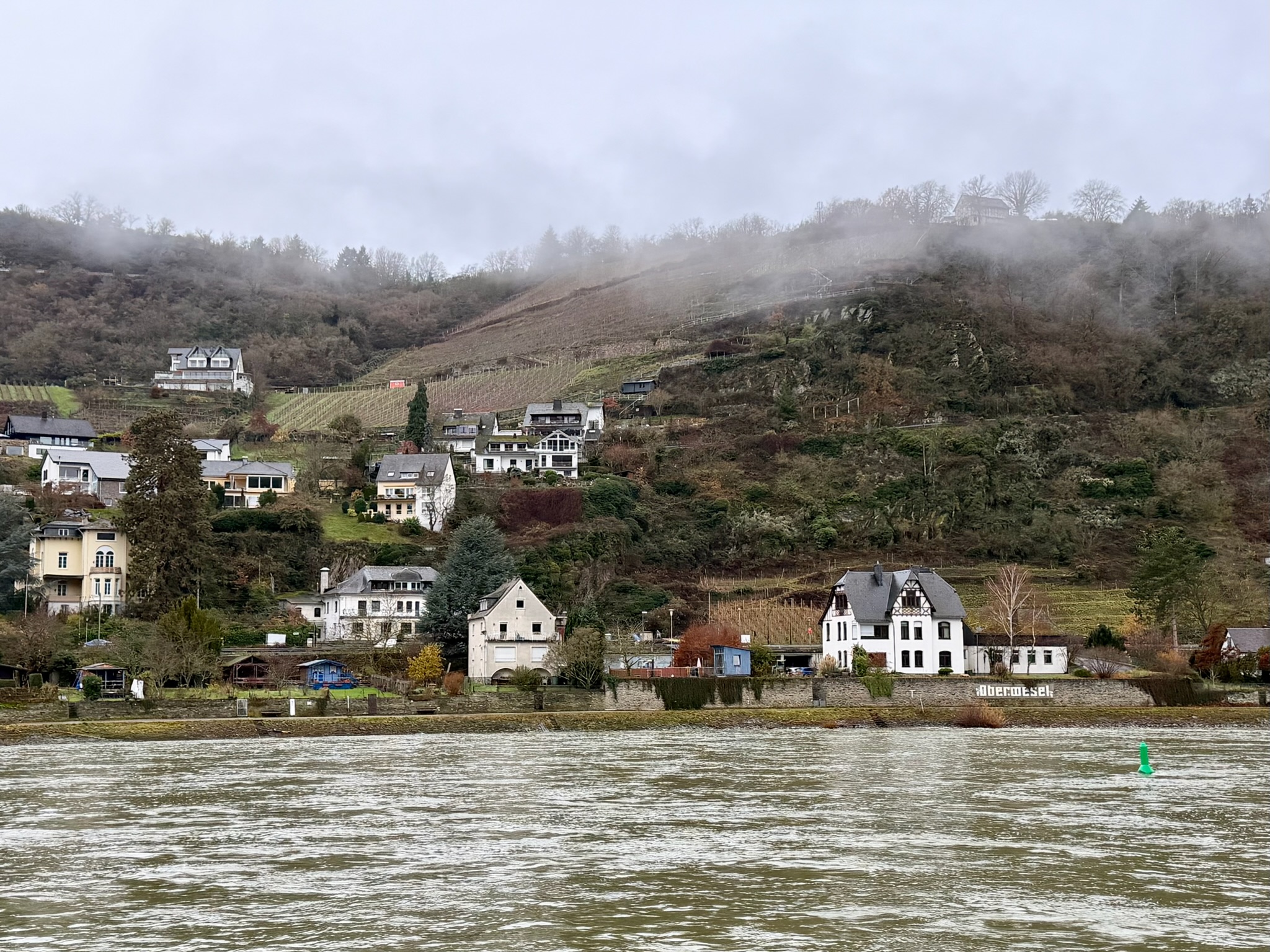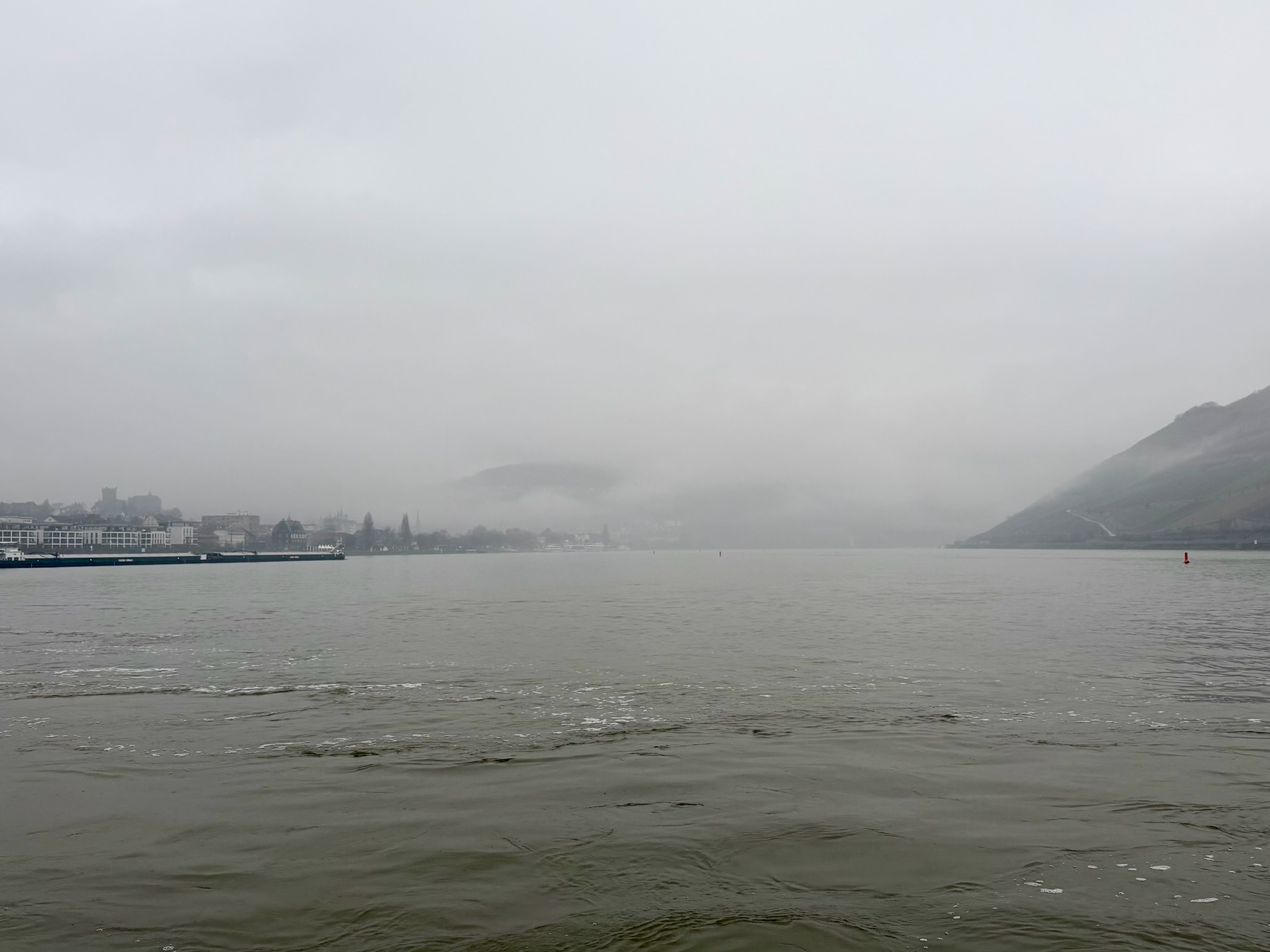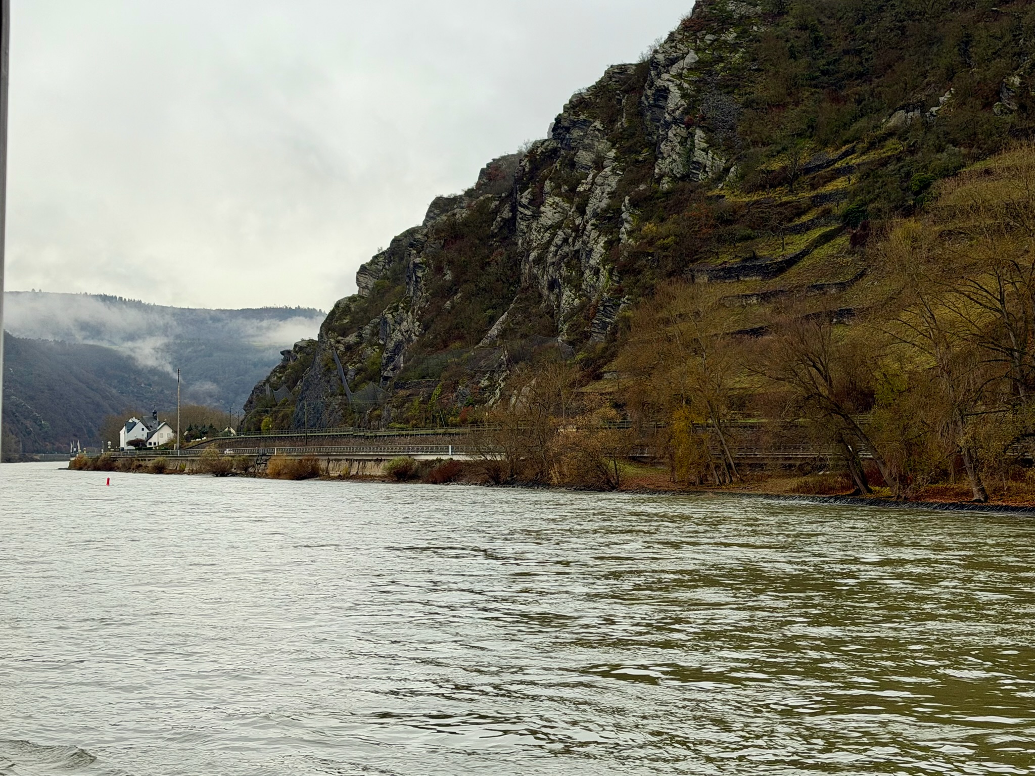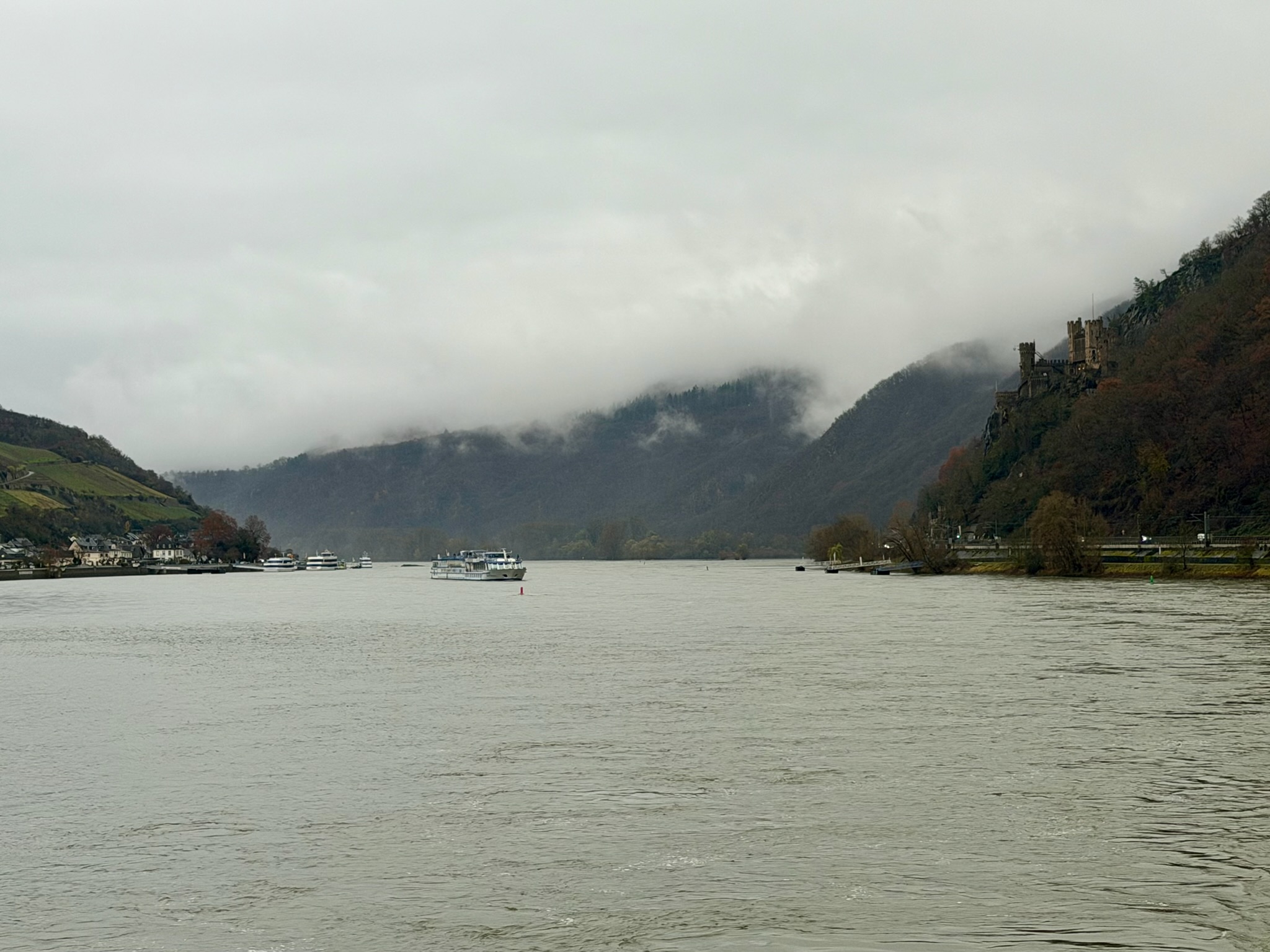 After grabbing my coat, I started on the sun deck – even in the wet, the Rhein is beautiful! Low, misty clouds hanging over the castles, vineyards and villages.