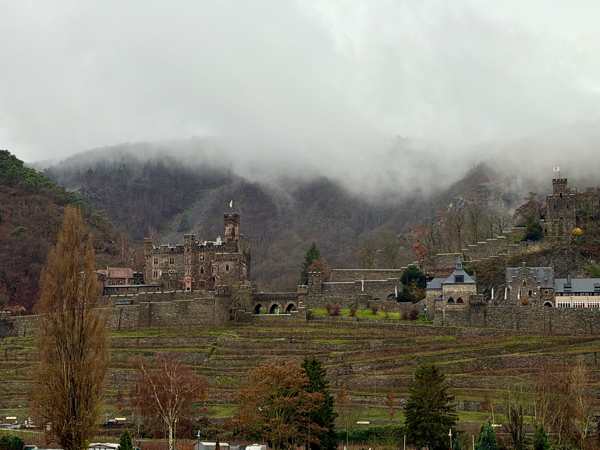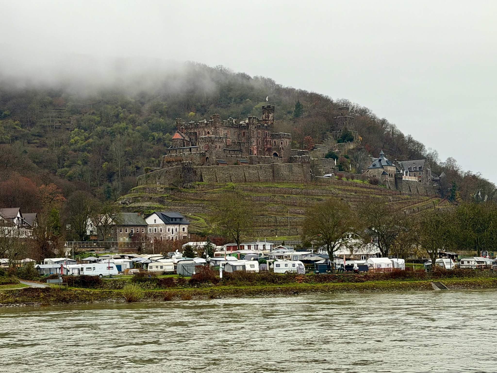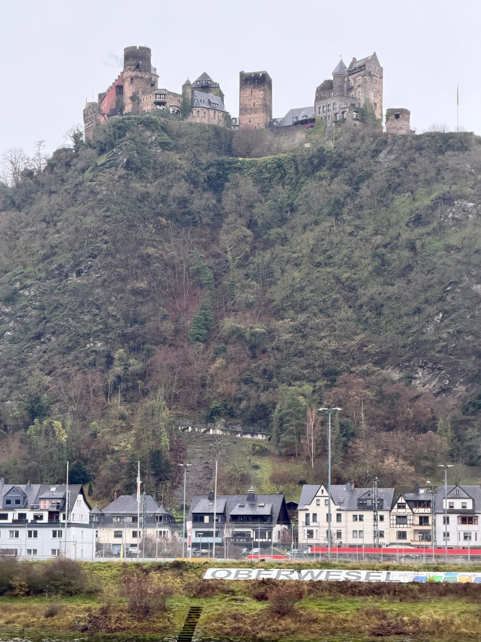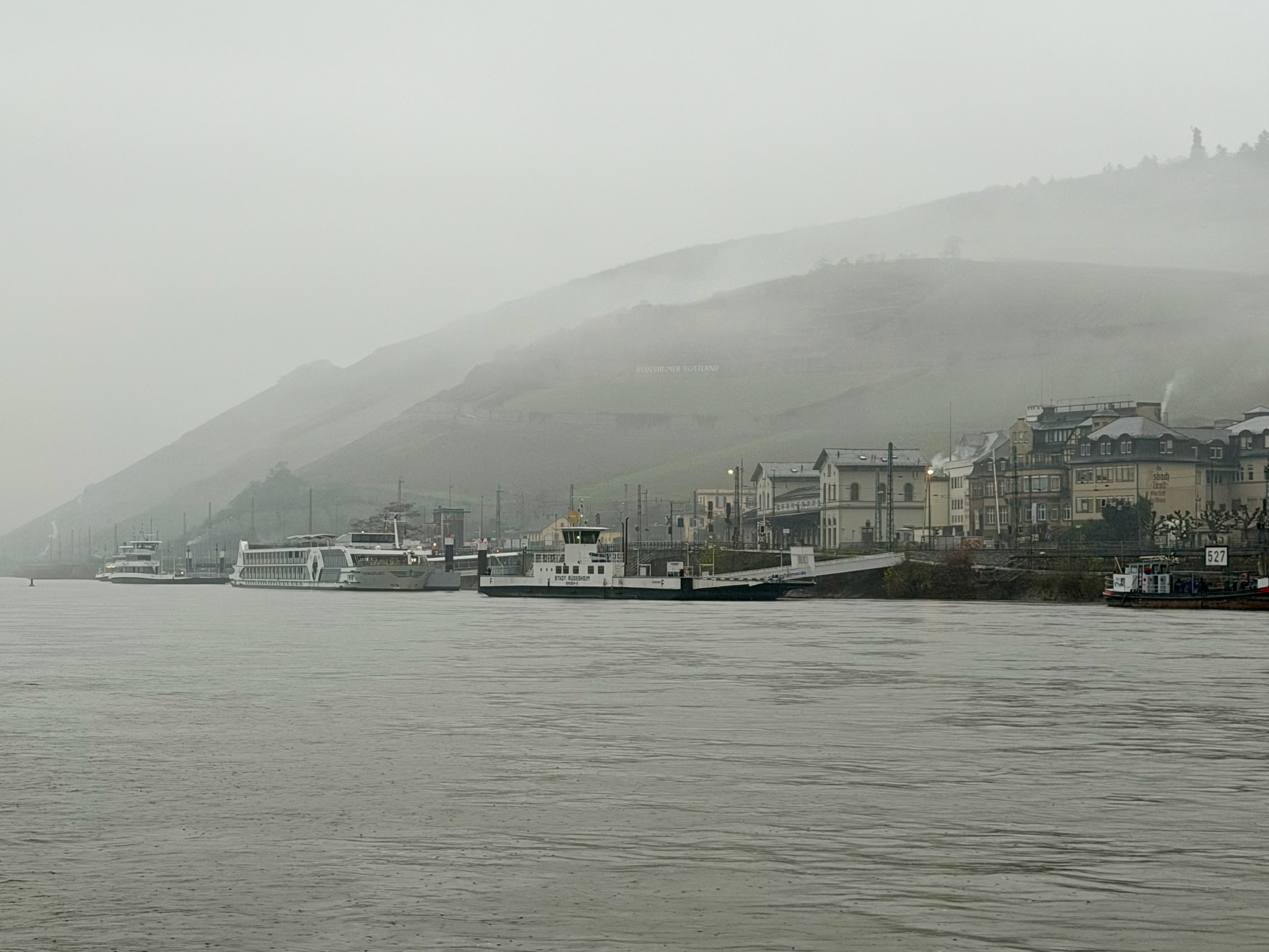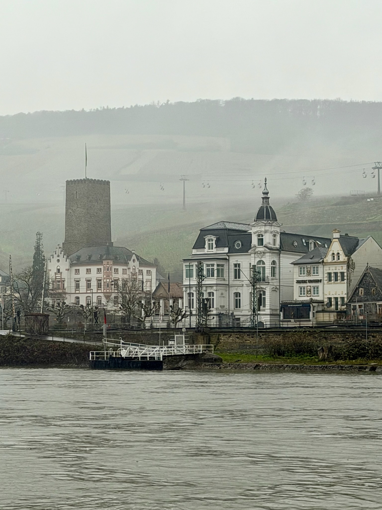 After grabbing my coat, I started on the sun deck – even in the wet, the Rhein is beautiful! Low, misty clouds hanging over the castles, vineyards and villages.