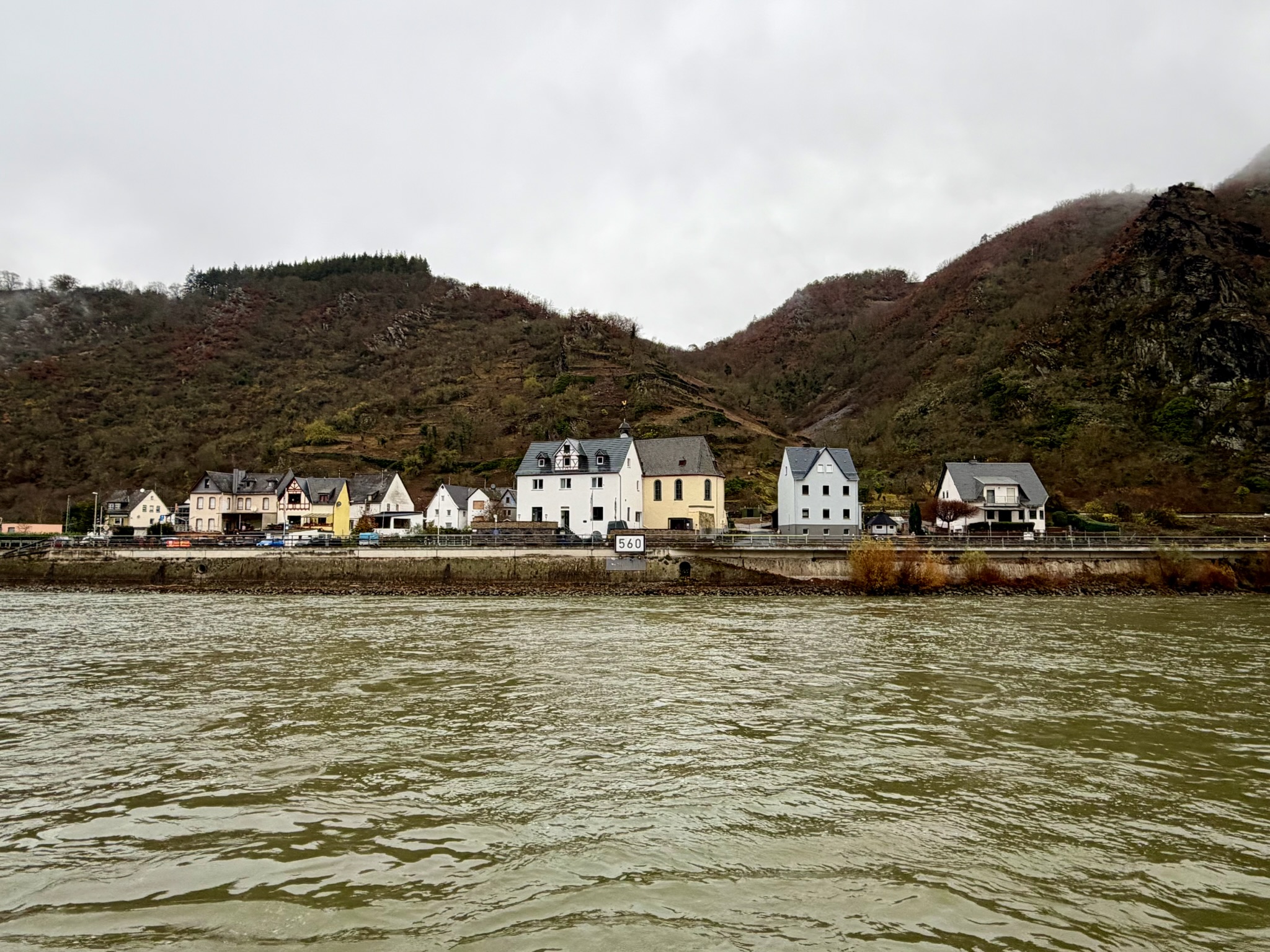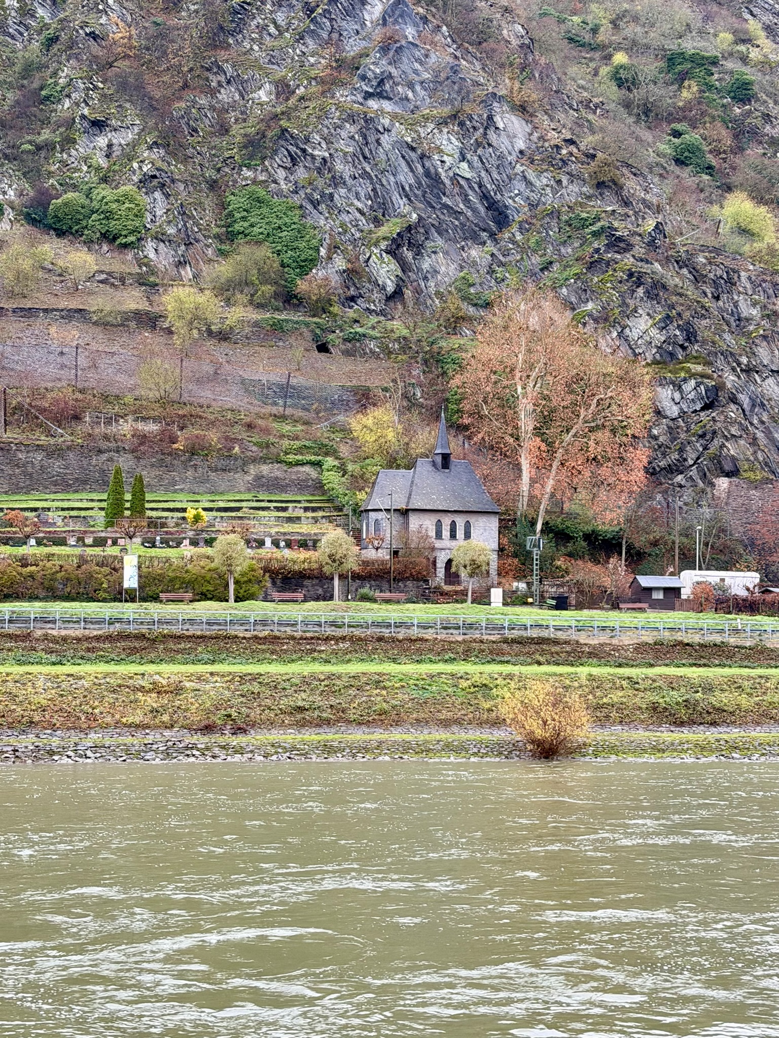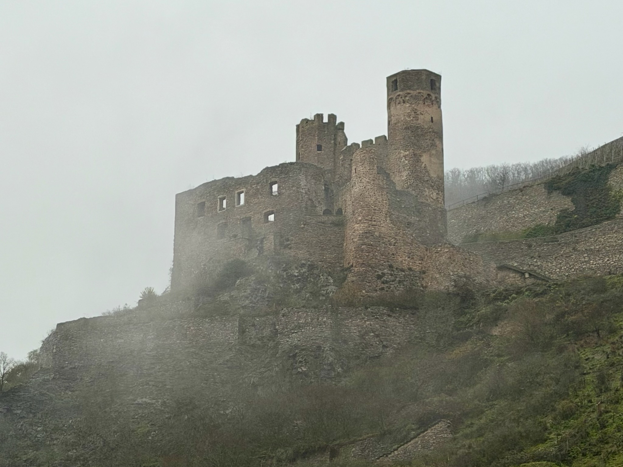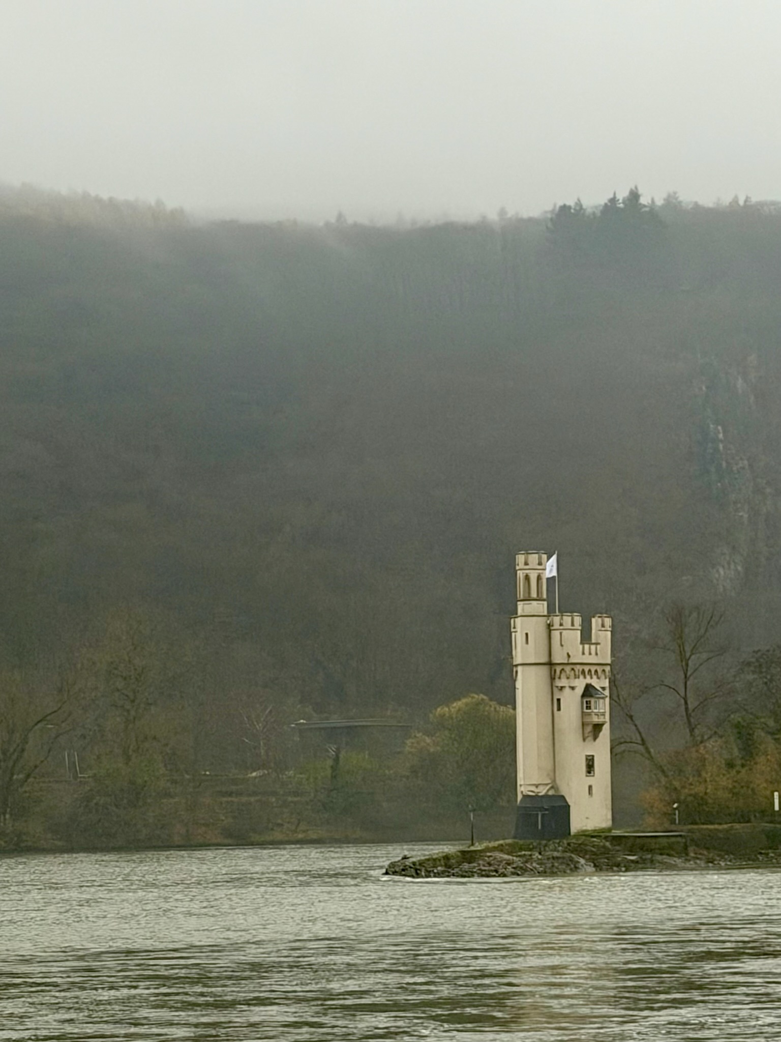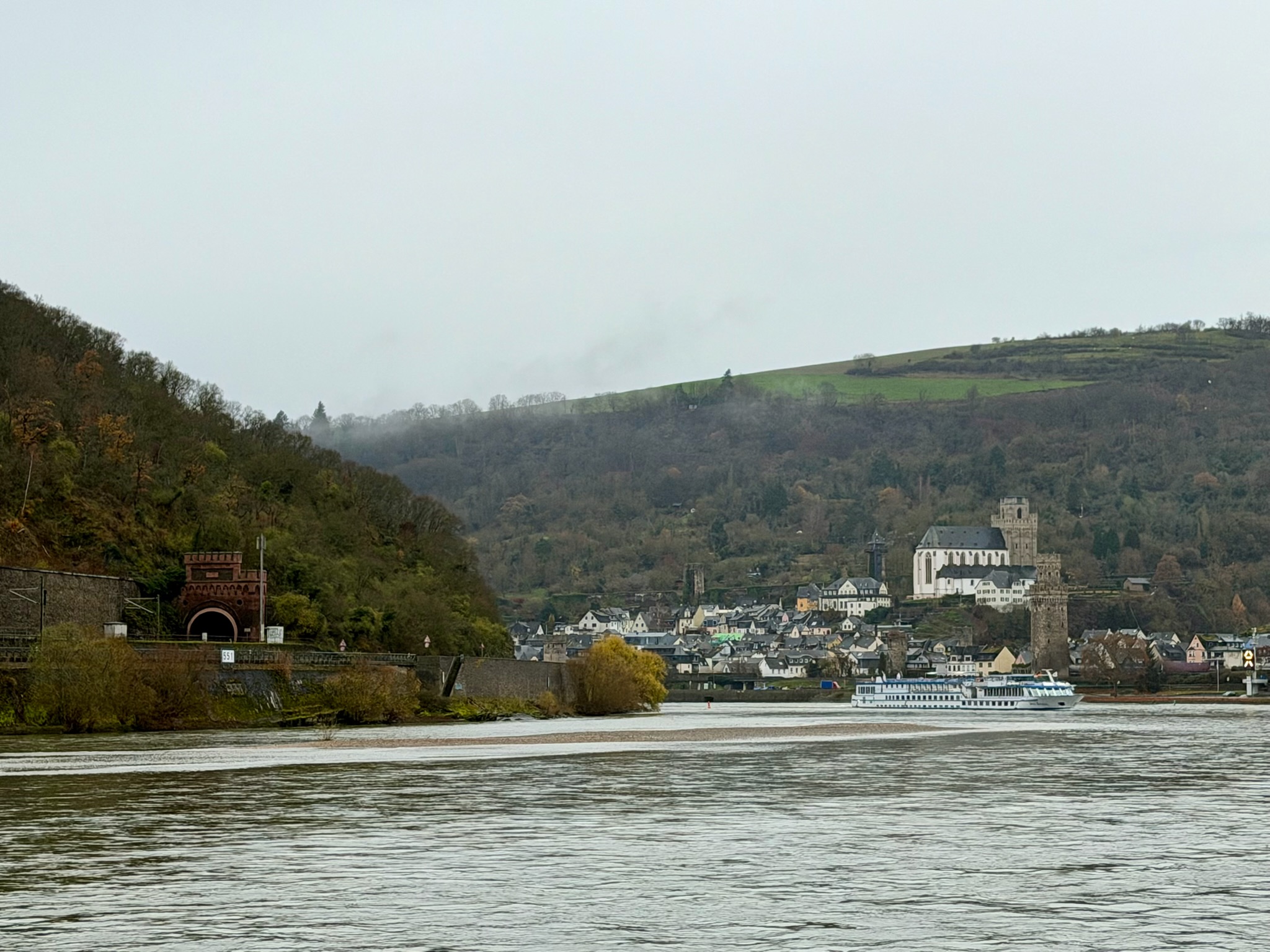 After grabbing my coat, I started on the sun deck – even in the wet, the Rhein is beautiful! Low, misty clouds hanging over the castles, vineyards and villages.