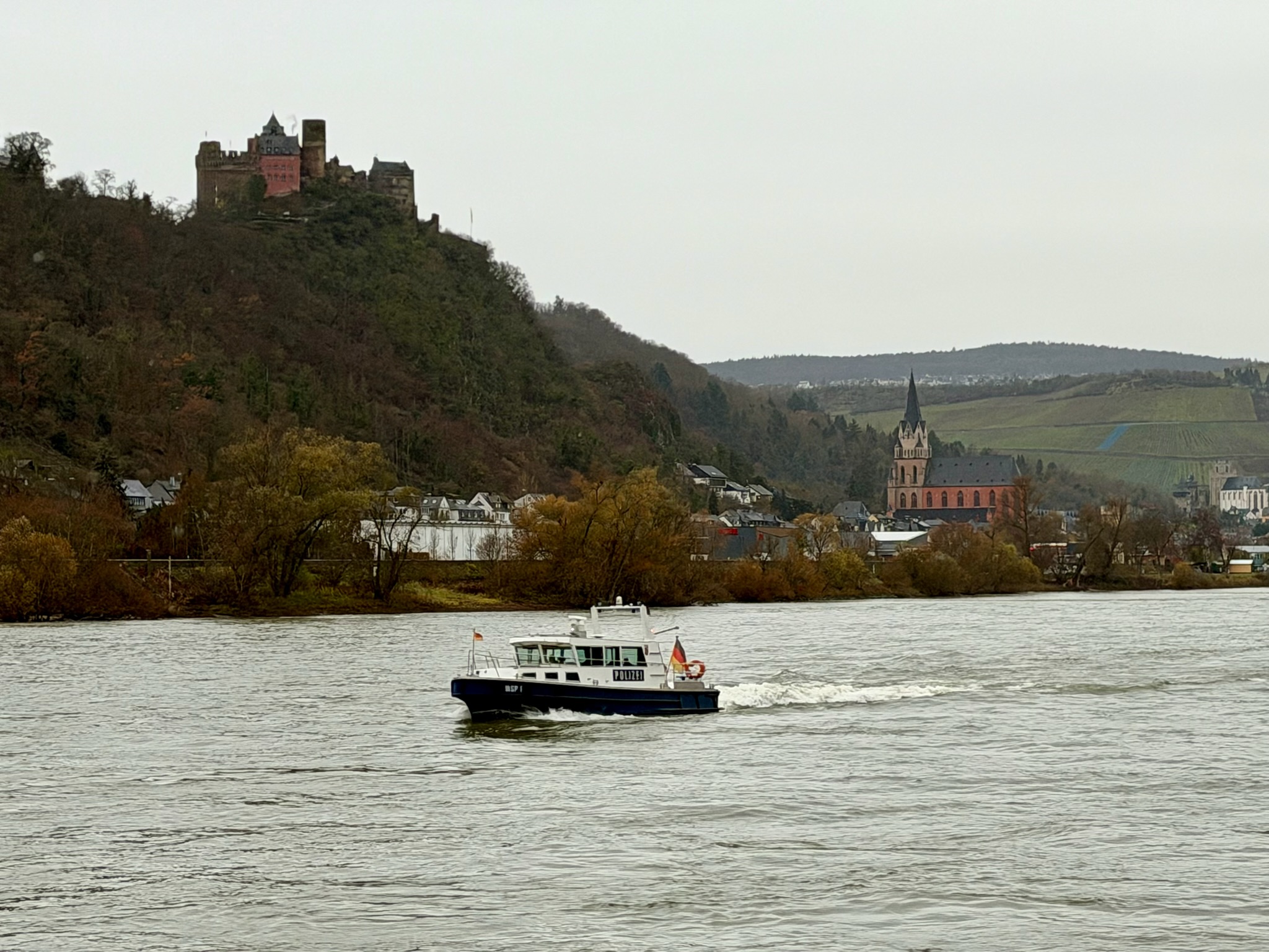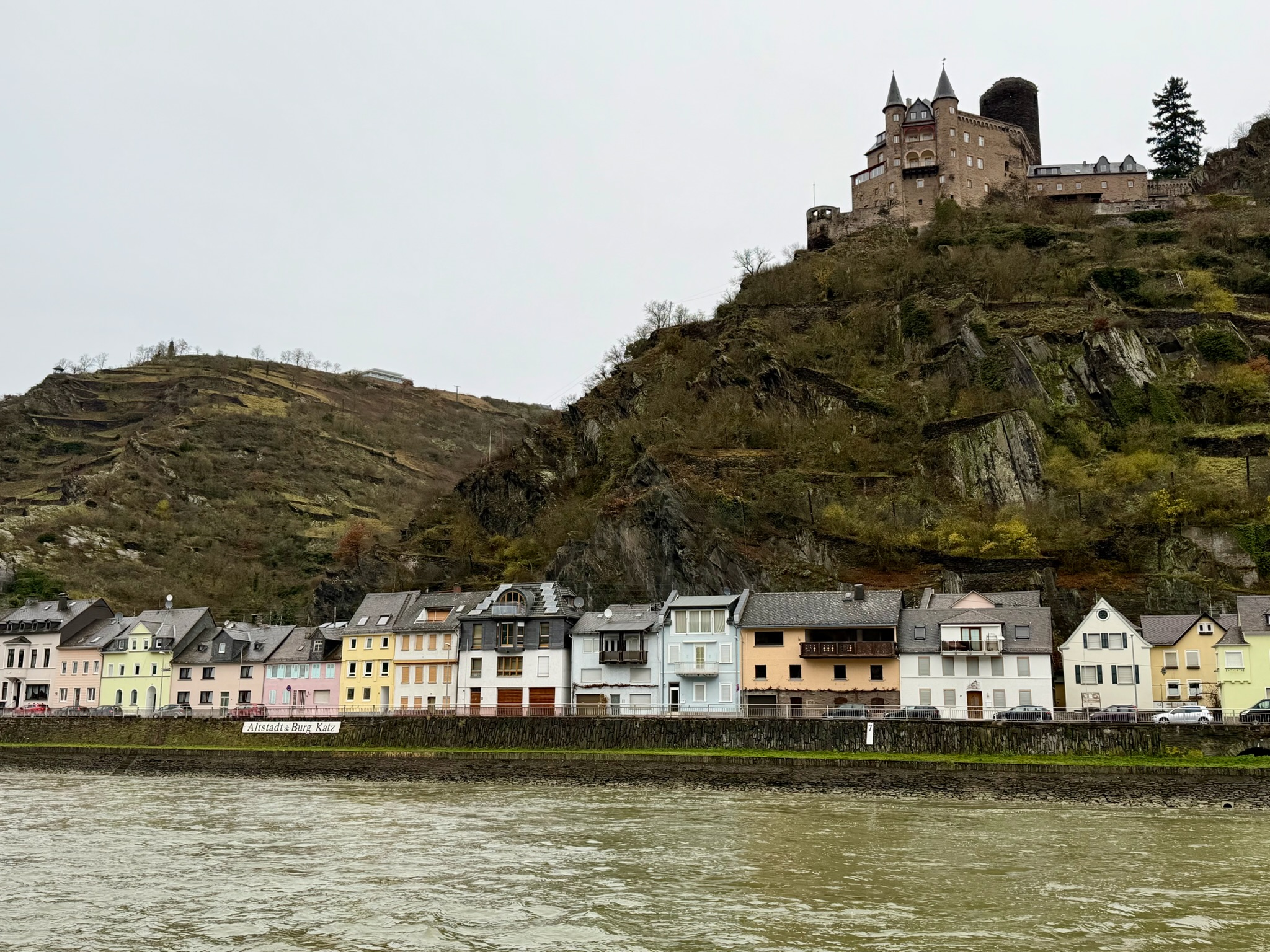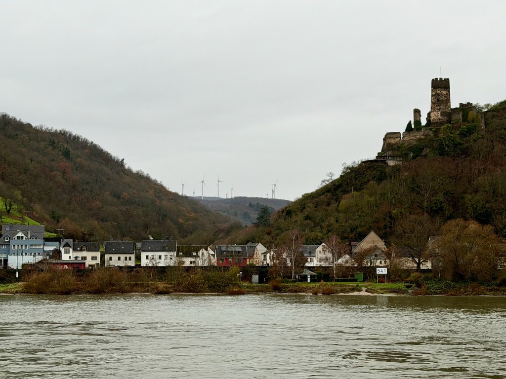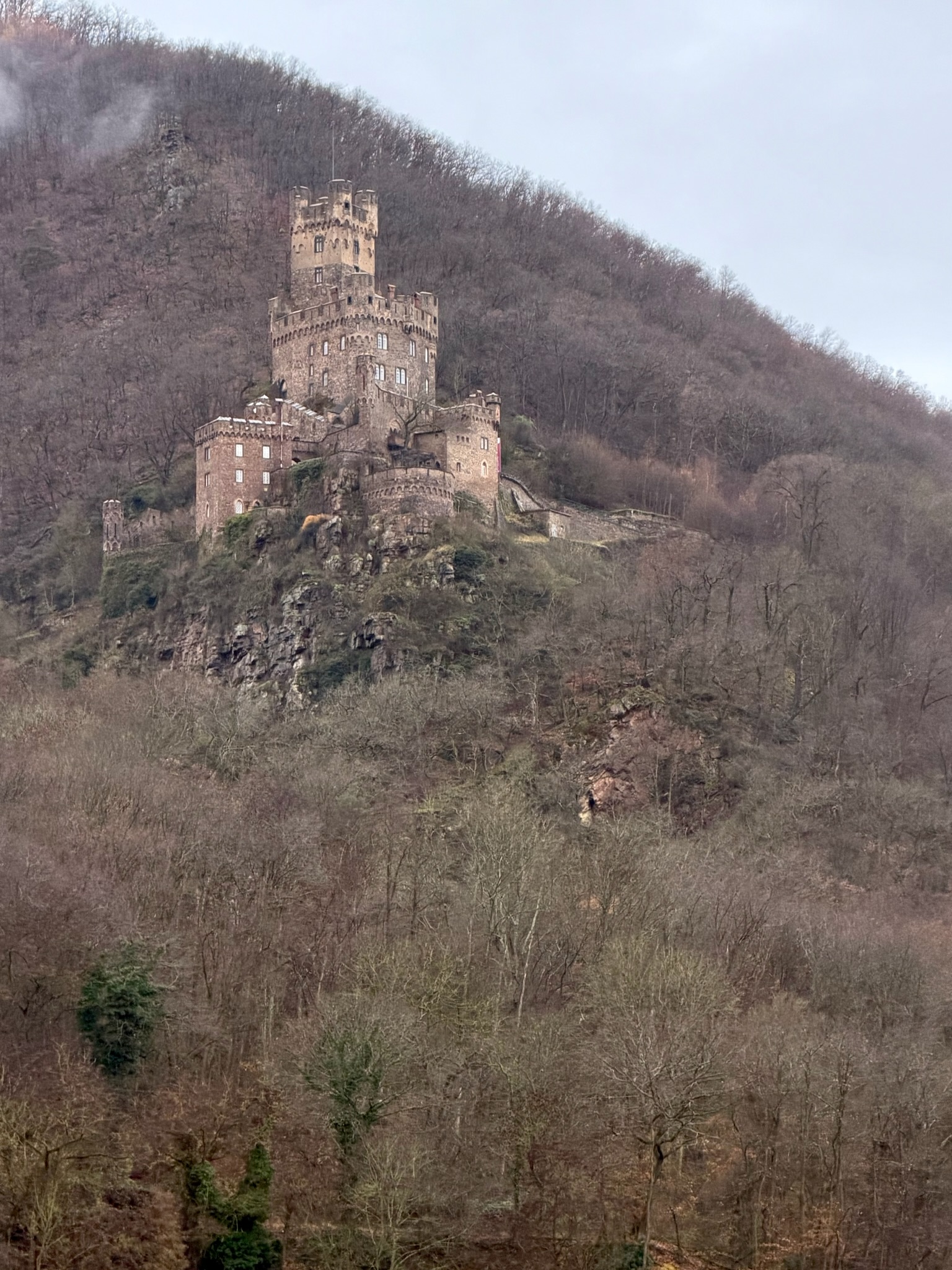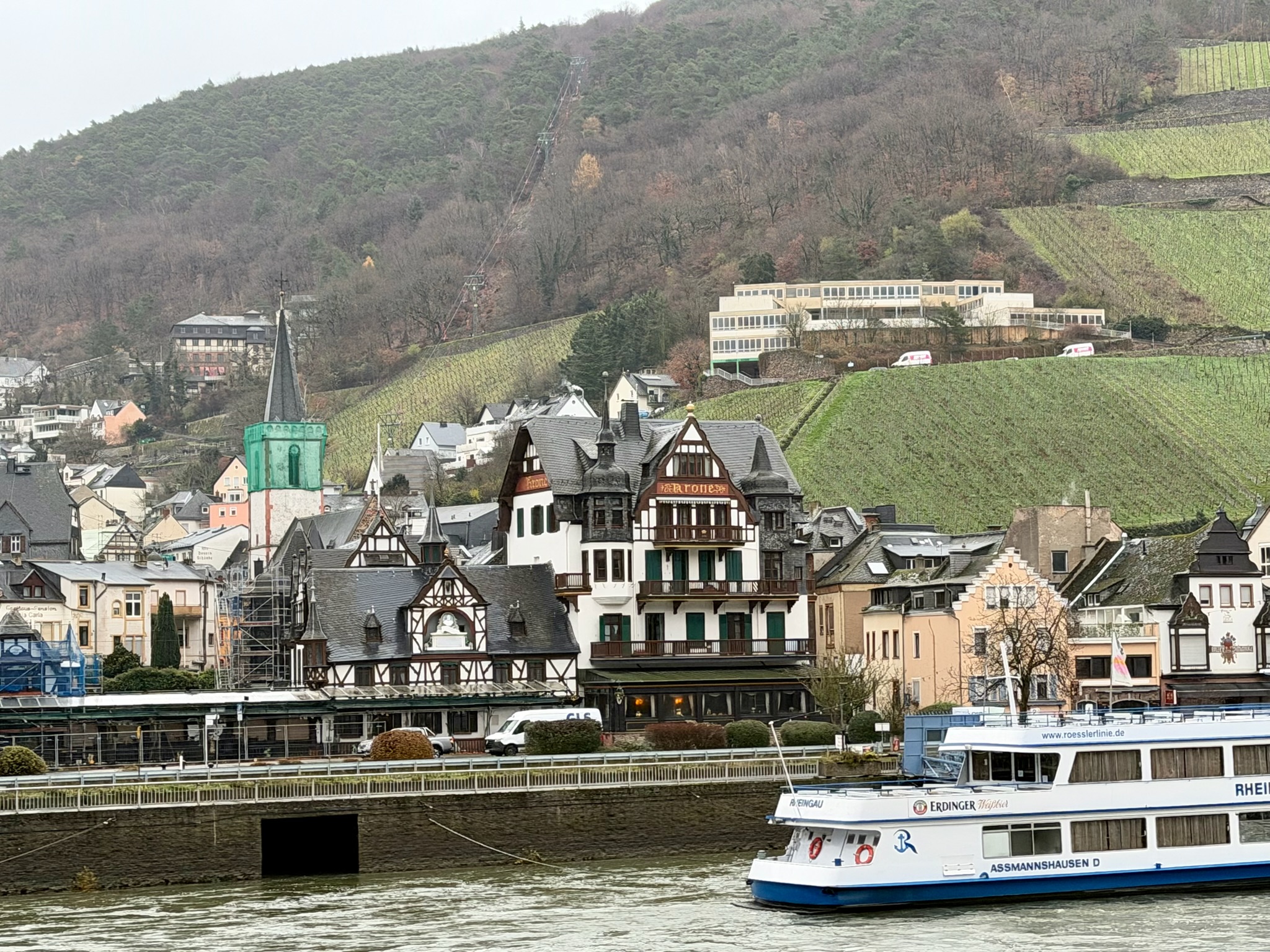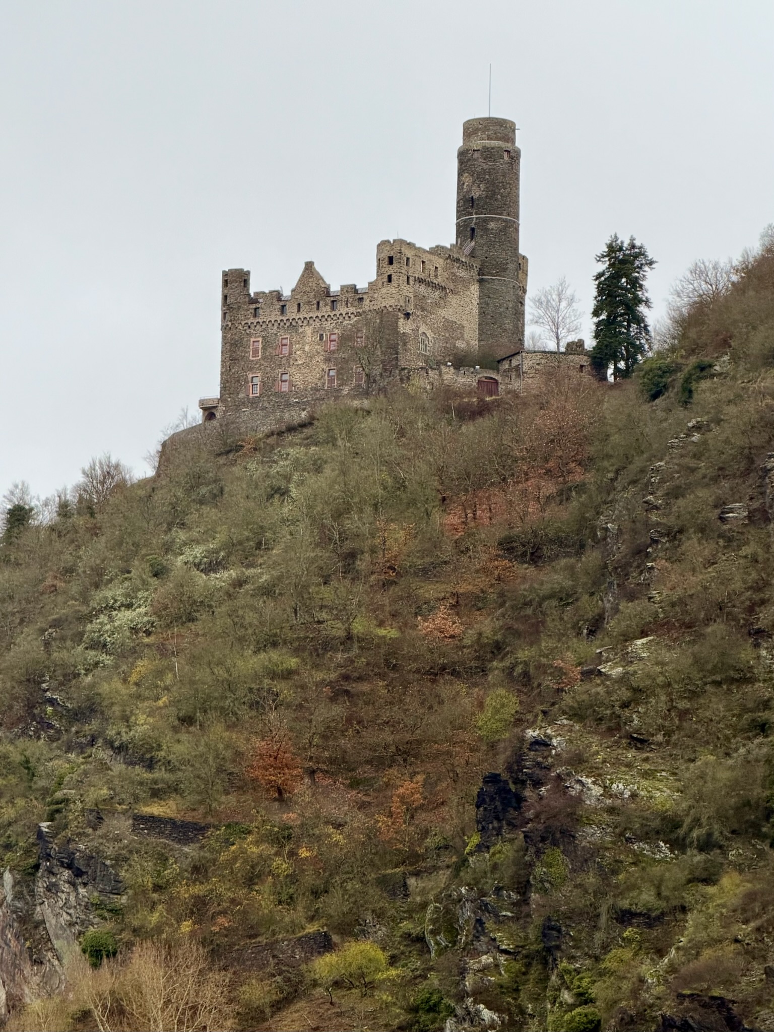 After grabbing my coat, I started on the sun deck – even in the wet, the Rhein is beautiful! Low, misty clouds hanging over the castles, vineyards and villages.