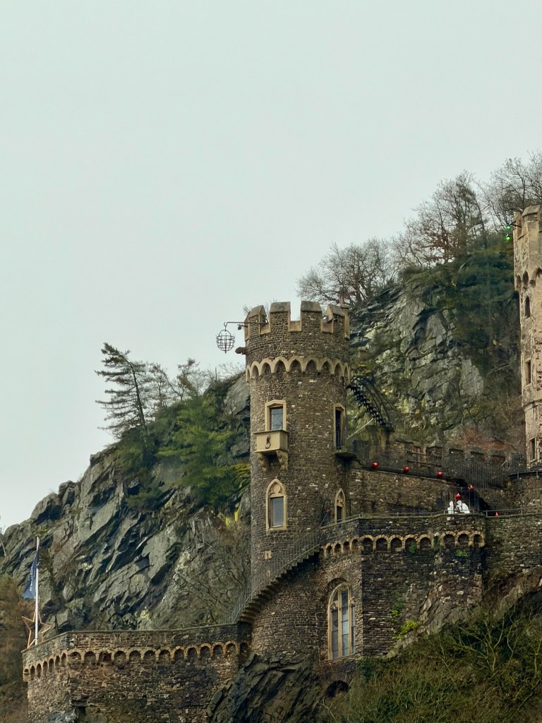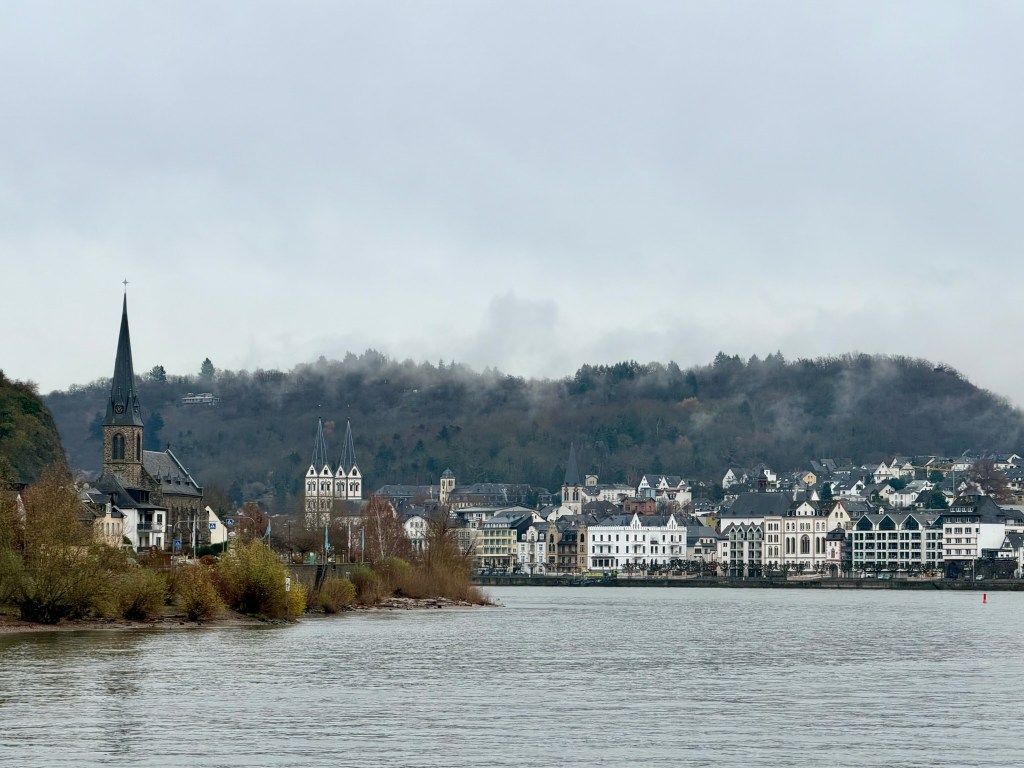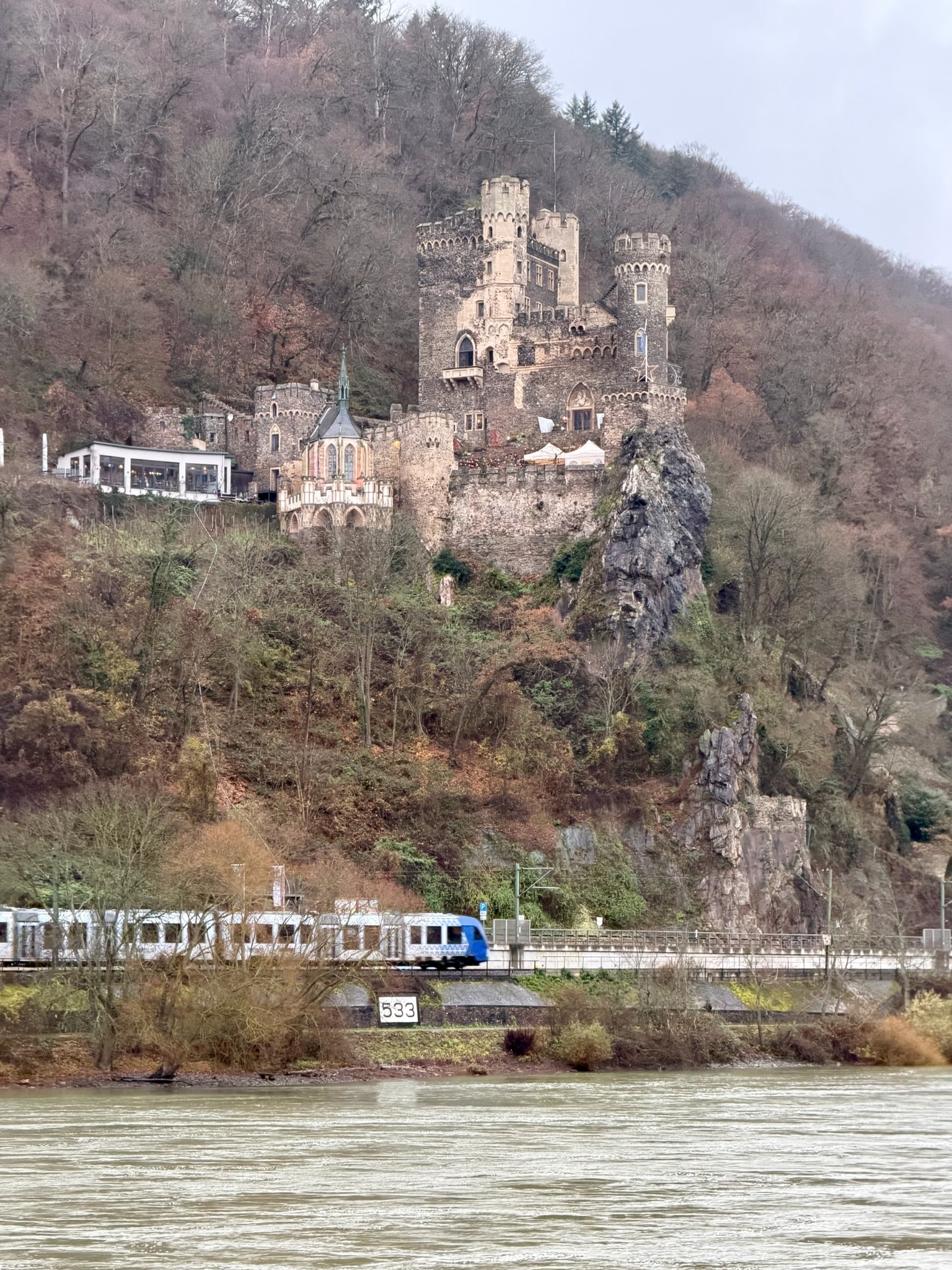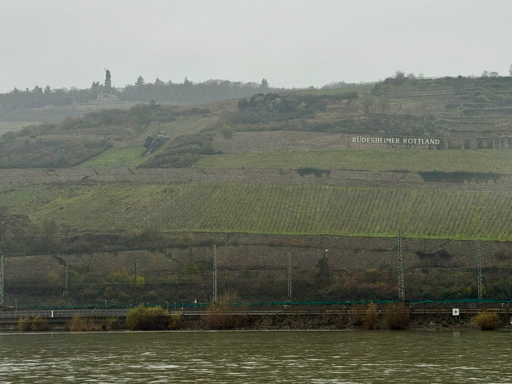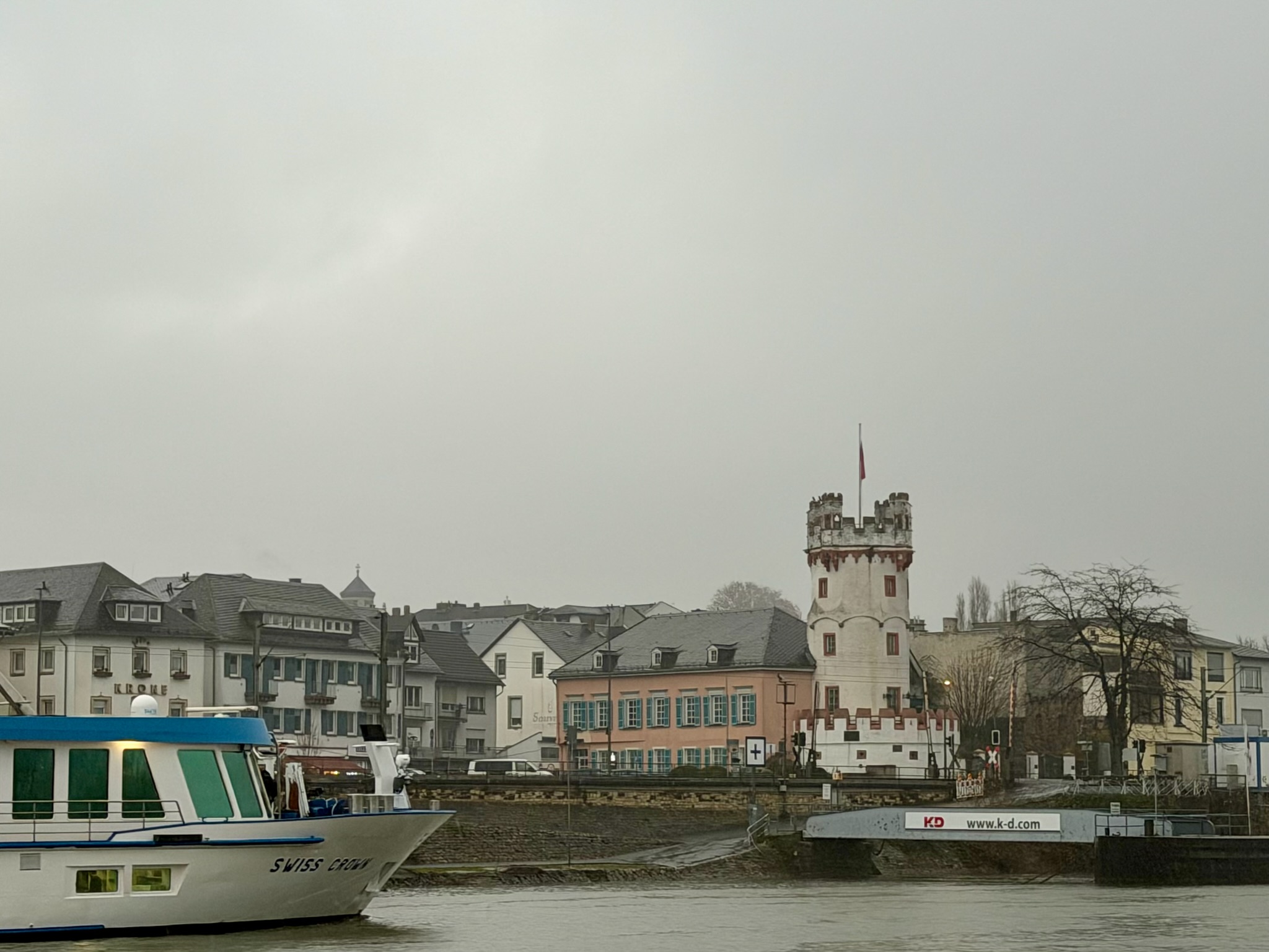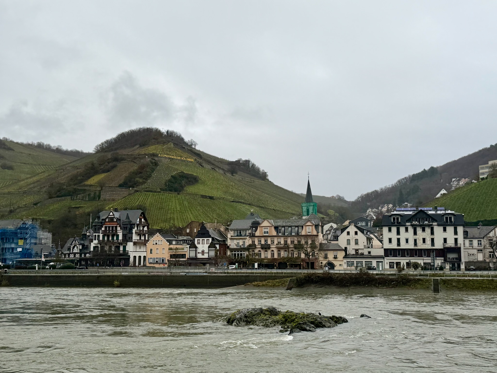 After grabbing my coat, I started on the sun deck – even in the wet, the Rhein is beautiful! Low, misty clouds hanging over the castles, vineyards and villages.