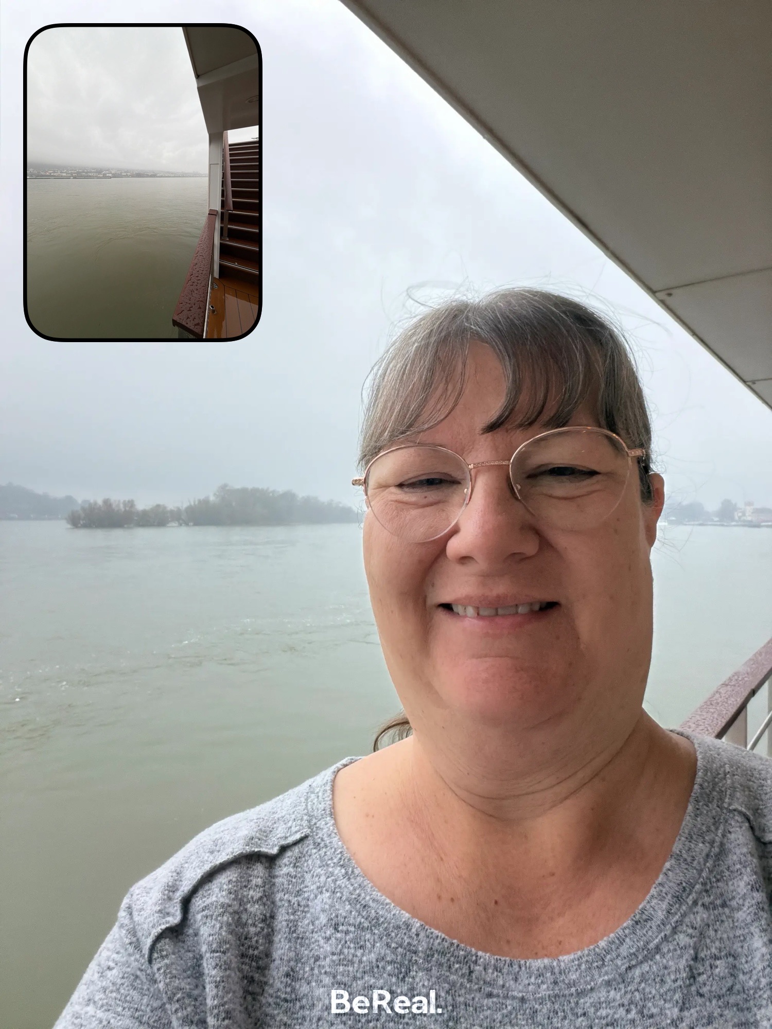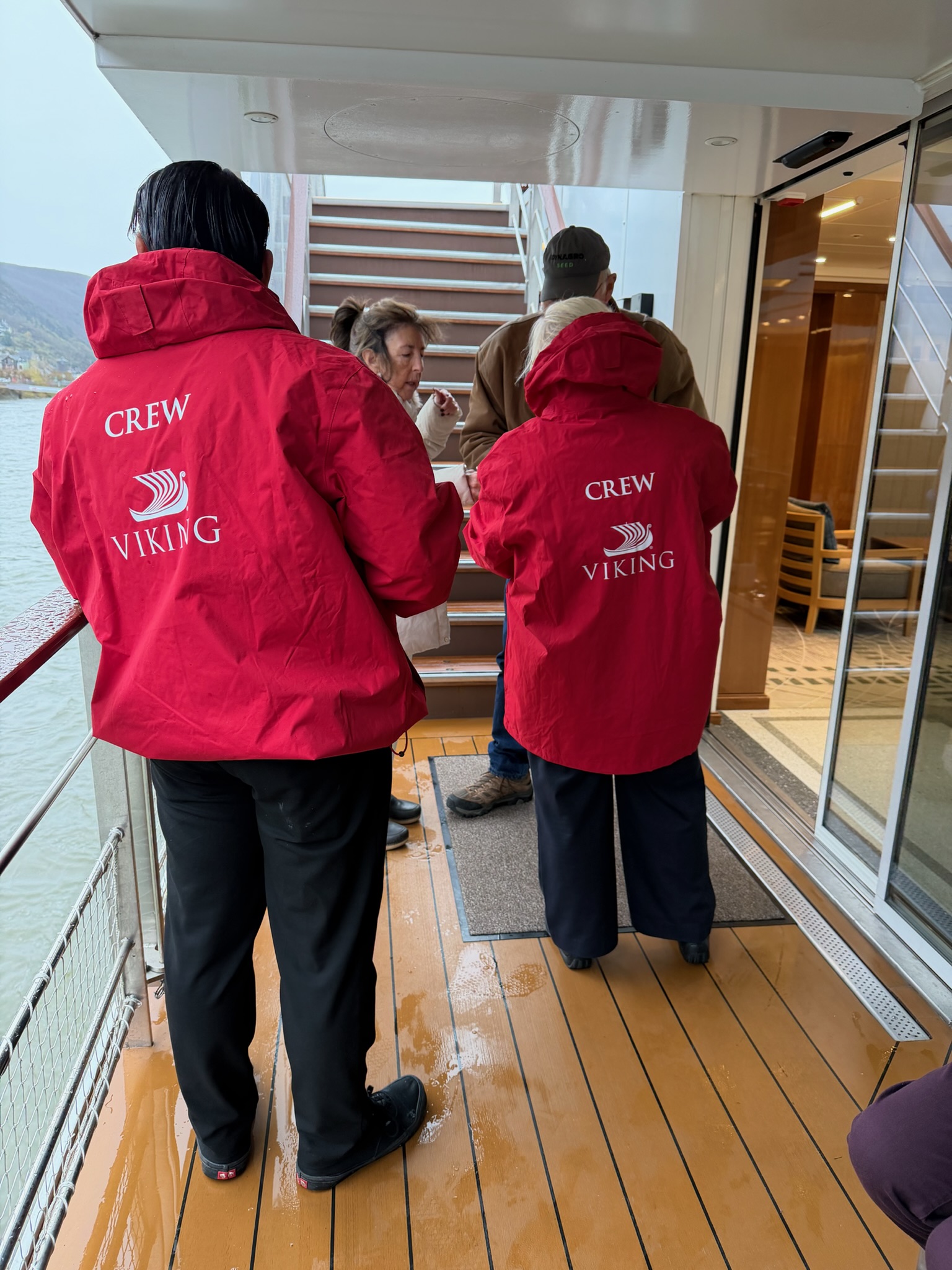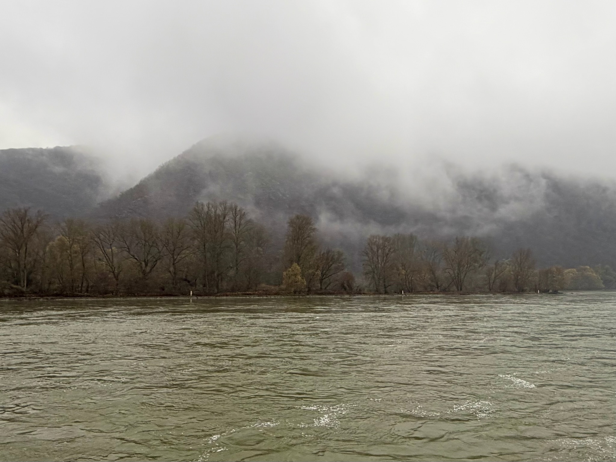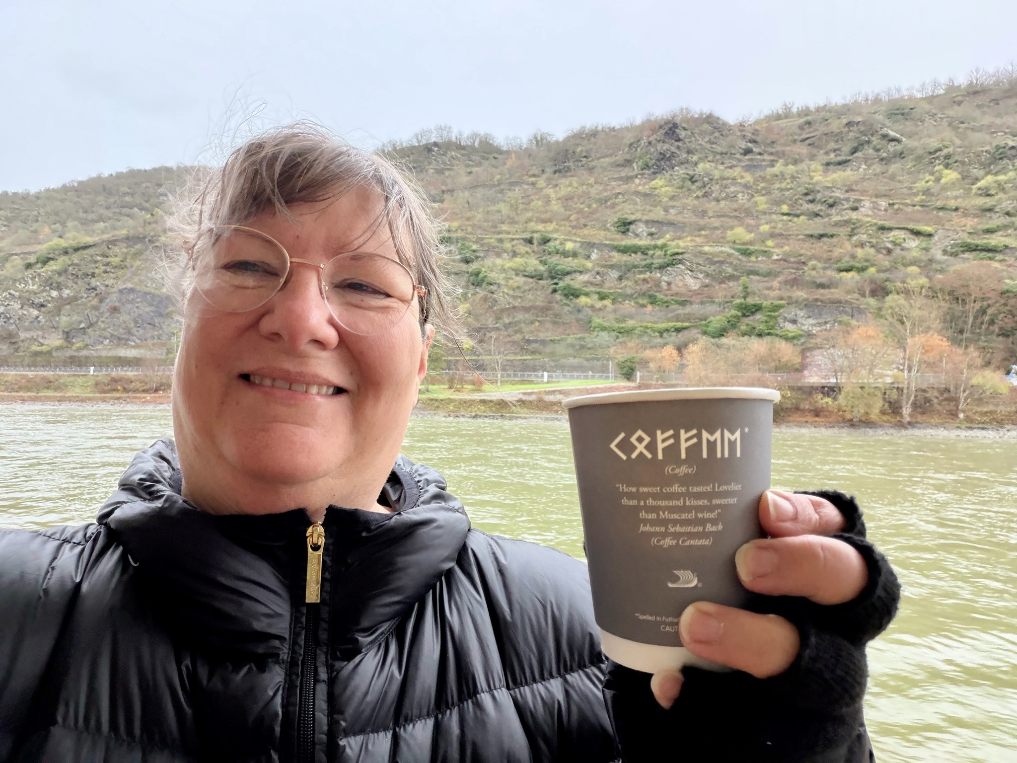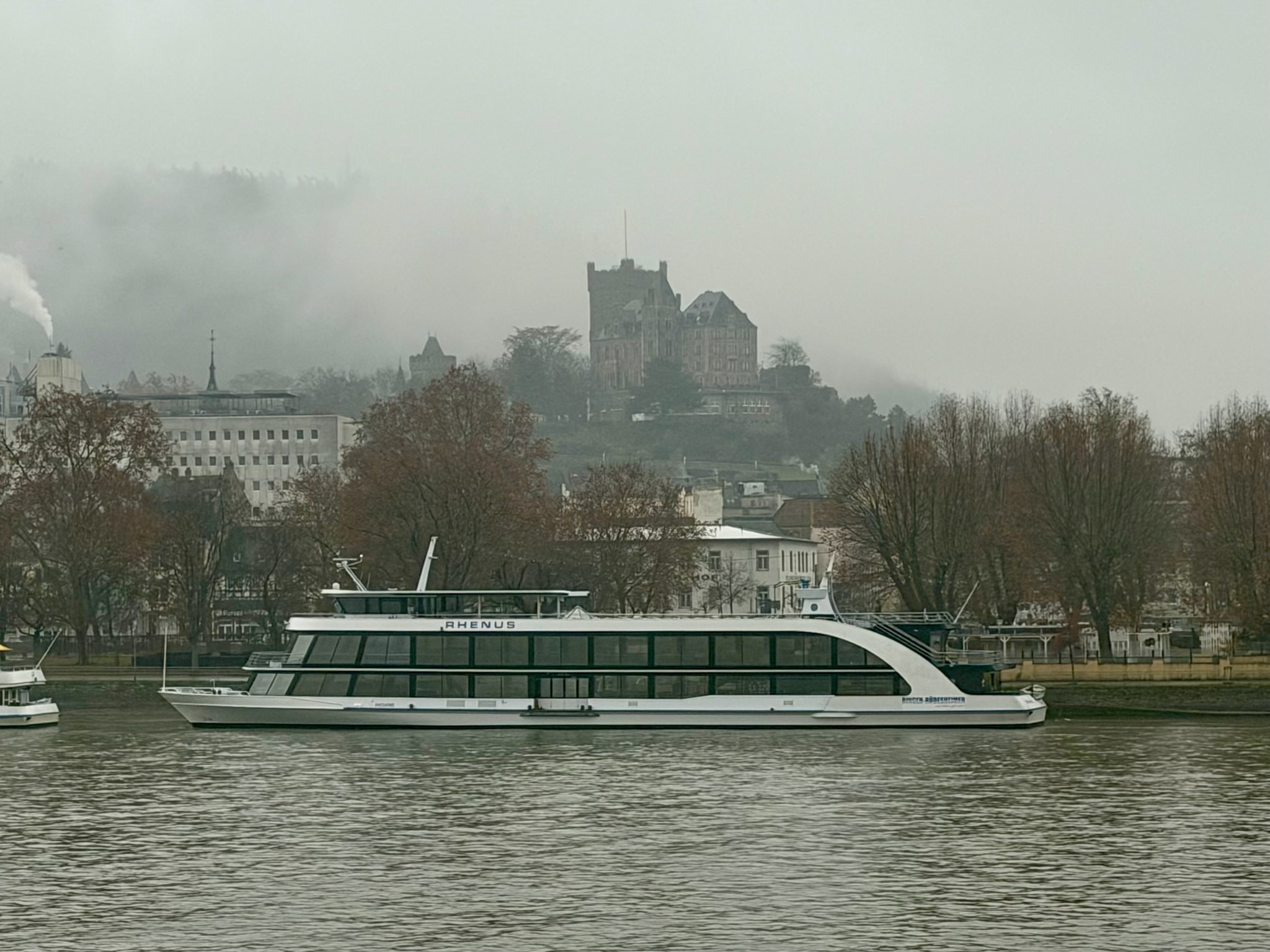 After grabbing my coat, I started on the sun deck – even in the wet, the Rhein is beautiful! Low, misty clouds hanging over the castles, vineyards and villages.