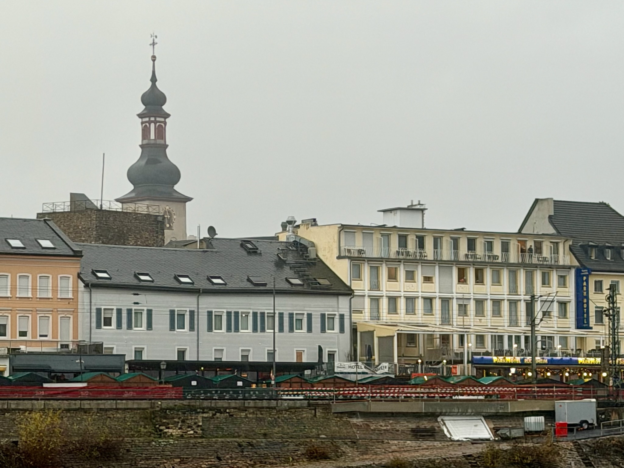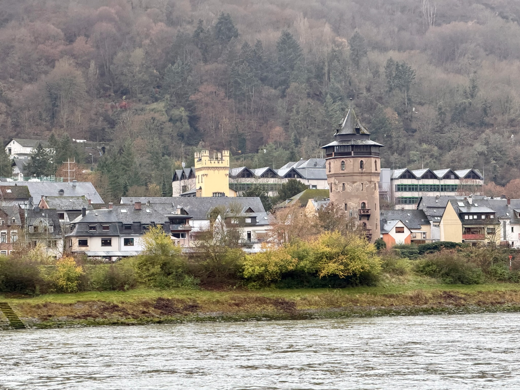This morning, Mom woke up not feeling well, so she stayed tucked up in her nice warm bed. I got up and out, though! After breakfast, I went out to take some pictures as we sailed away from Rüdesheim (we had stayed in overnight) and realized it was cold and wet.