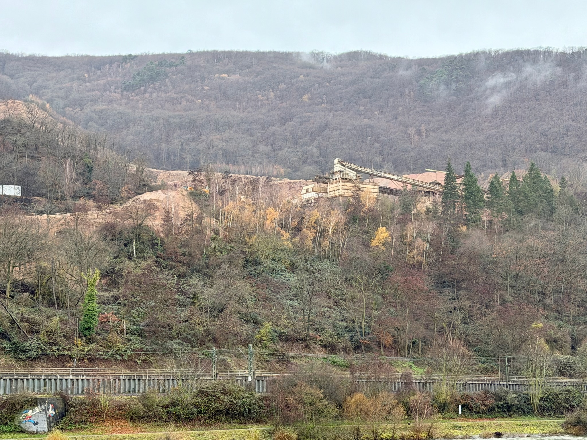The quarry mines red sandstone to be used in building. The conveyor belt will load the stone onto barges.