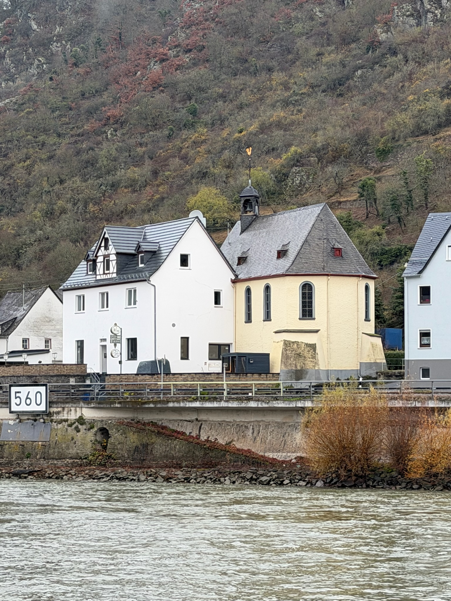 Sankt Goarshausen only has 13 houses! The white building is the bar that leads into the yellow church – and the bar is the only entry to the church! And the mayor is also the barkeep and preacher!