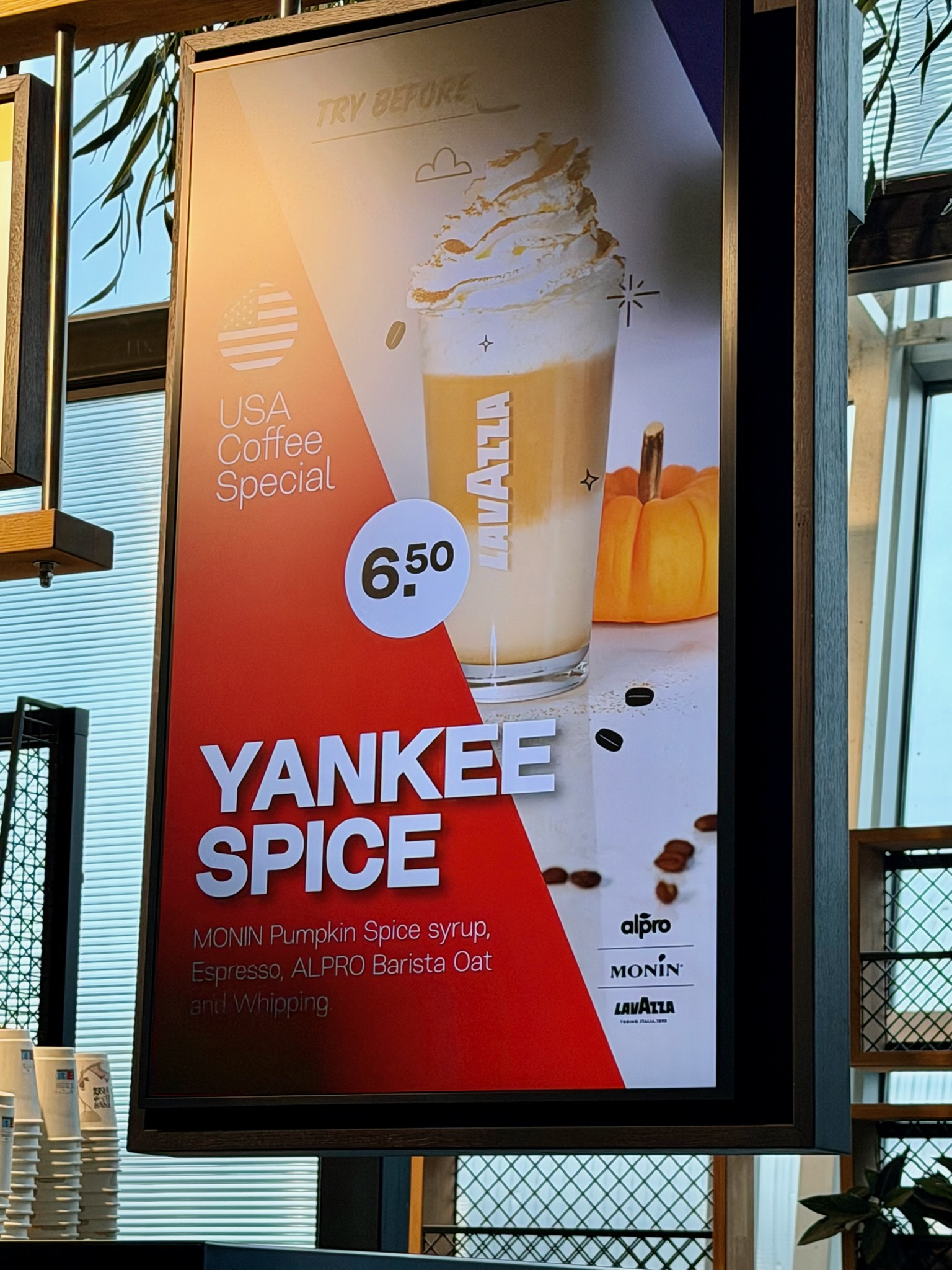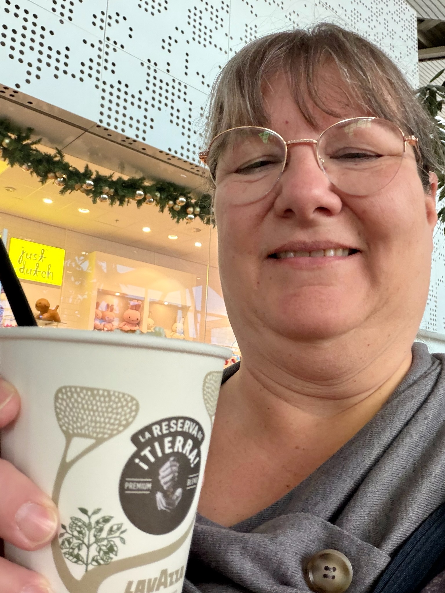 Then it was through security (which was extremely well organized and easy) and passport control – where we got our passports stamped again! We found our gate and I left Mom to go do a little bit of shopping. Thanks to the lovely shopkeeper at the cheese store who sent me with a little baggie of Gouda samples. Most importantly, I had a Yankee Spice coffee! (Pumpkin spice with oat milk – delicious!)