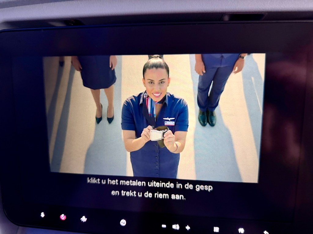 We have a little “two-er” set of seats on the flight to Philadelphia, which is just under 8 hours. The safety message was given first in English, then Dutch!